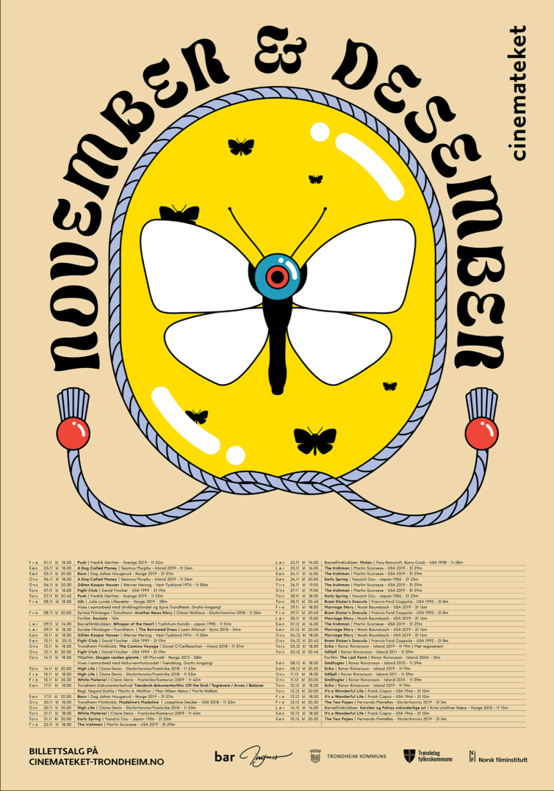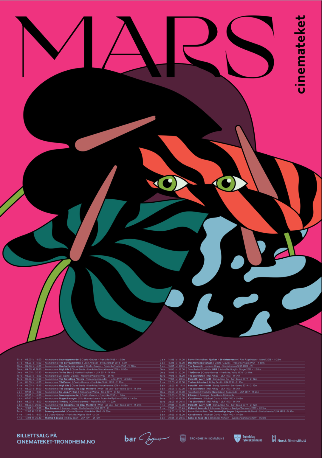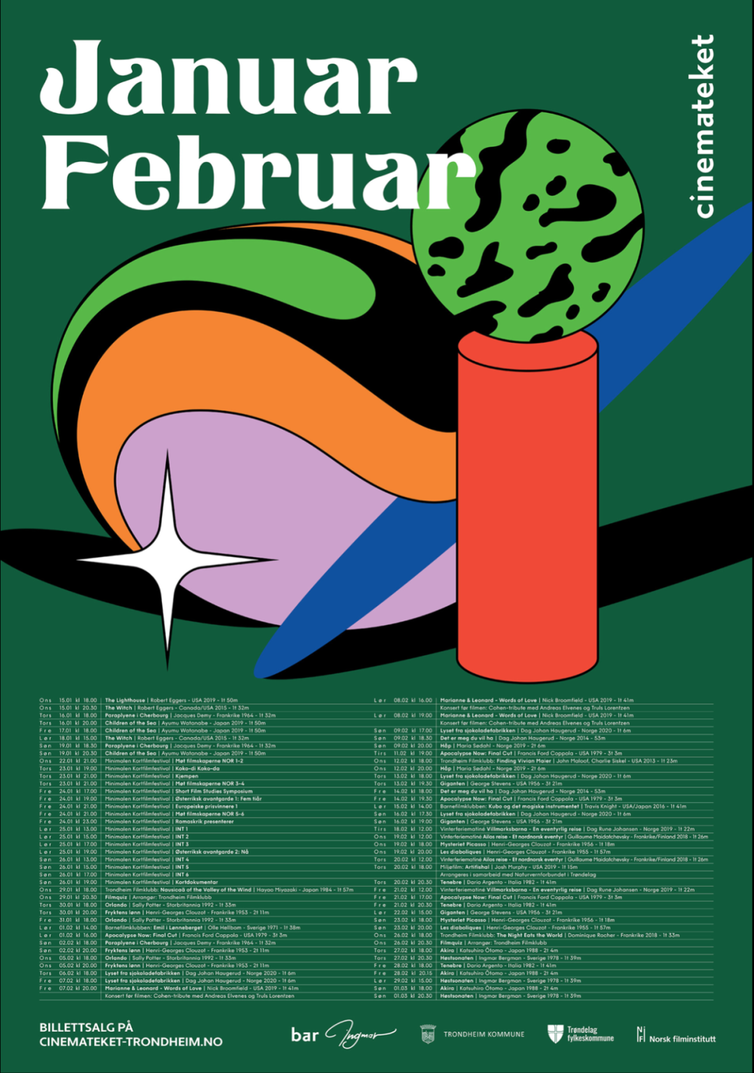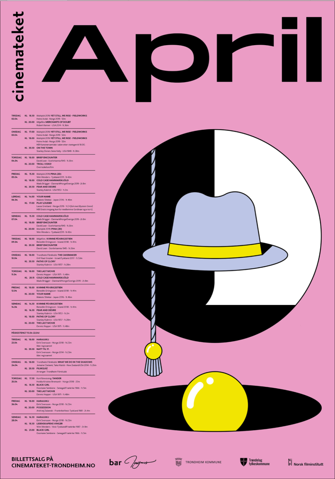 丹麦一家叫做Hugmun的设计工作室,为一家名为Cinemateket Trondheim的电影院,设计了一年的月度计划系列海报。设计师用简洁、抽象的插画来表现与电影相关的内容,每一张海报都有着丰富、艳丽的色彩,标题字体根据不同插画的气质而做出变化。另外,大部分海报都有眼睛元素,旨在传递沉浸式观影和穿越时空的体验。