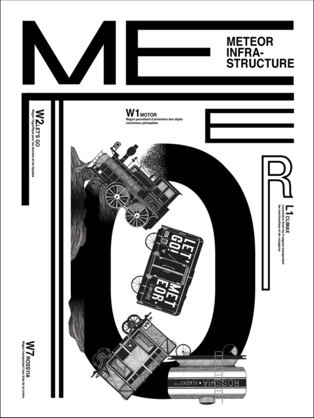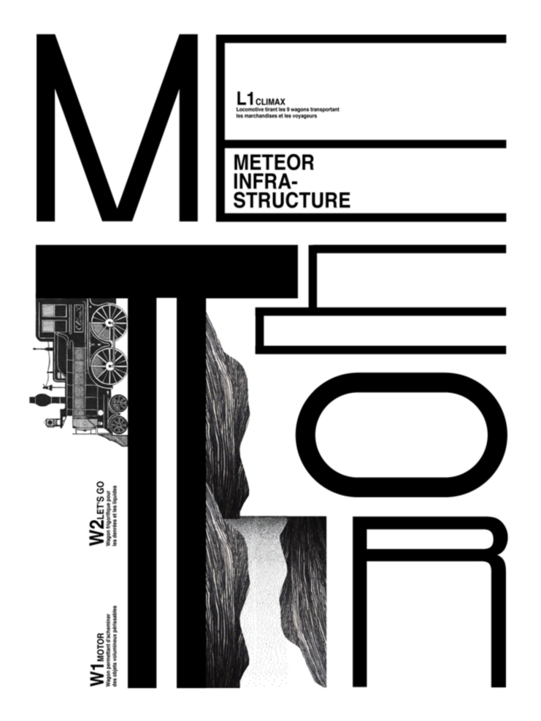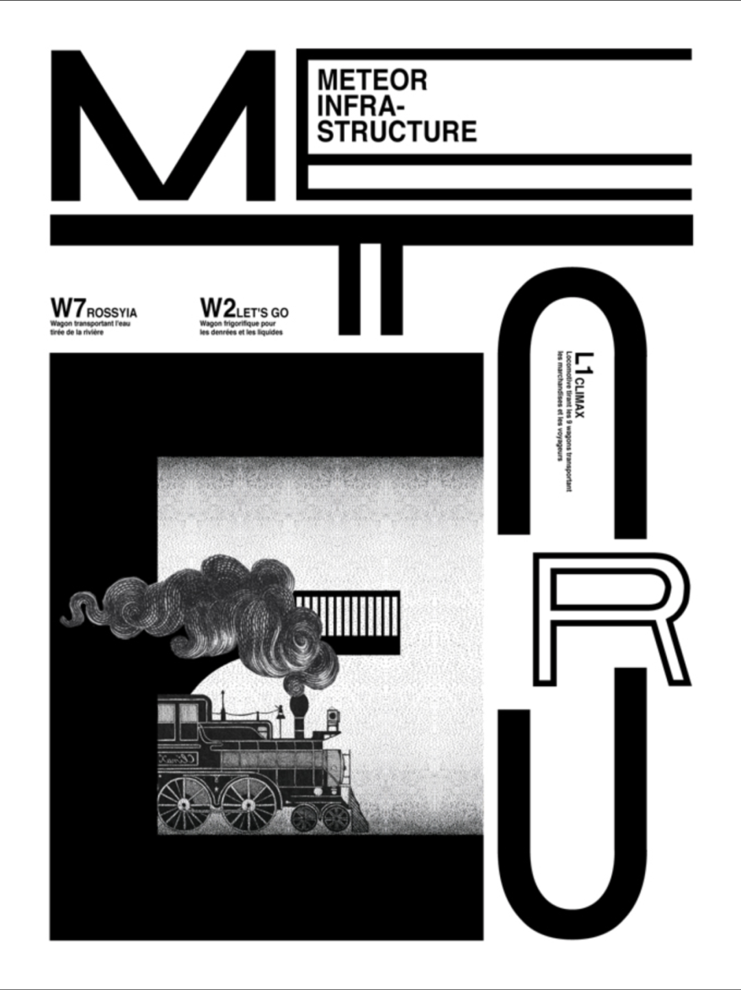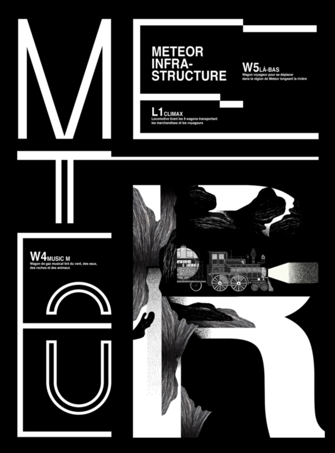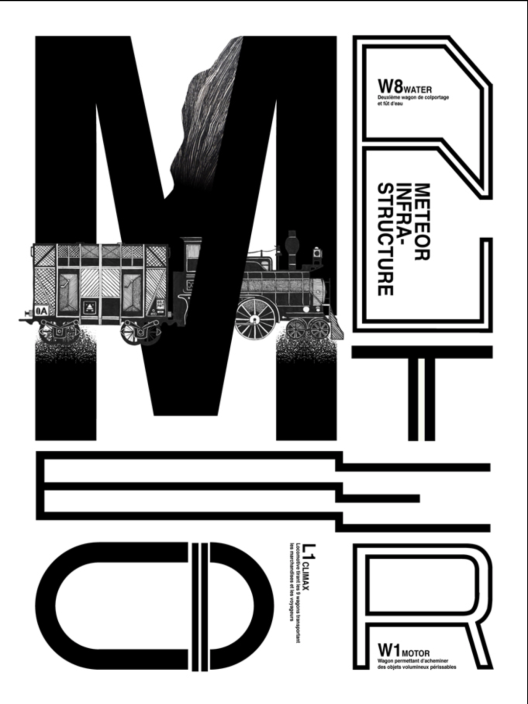 这组海报出自法国设计工作室:My Name Is Wendy,为一个叫做流星计划的项目所设计,该系列海报都是以火车以及Meteor(流星)为设计主体。精细的插画与简洁、硕大的无衬线英文字母相结合,呈现出强烈的繁简对比。为了突出主体,没有搭配插画的字母笔画都相对细很多,内文的字号则尽量缩小,与Meteor穿插排版,整体看起来大气而又细腻。以黑白灰作为主色,使海报的复古和工业气息更加浓厚。