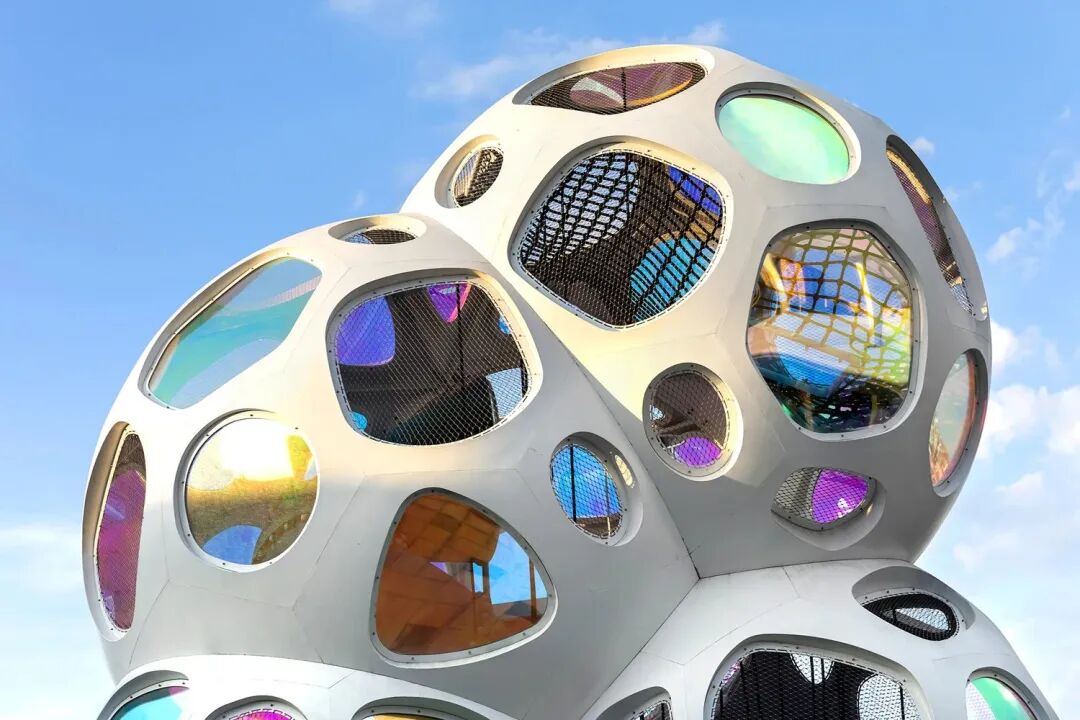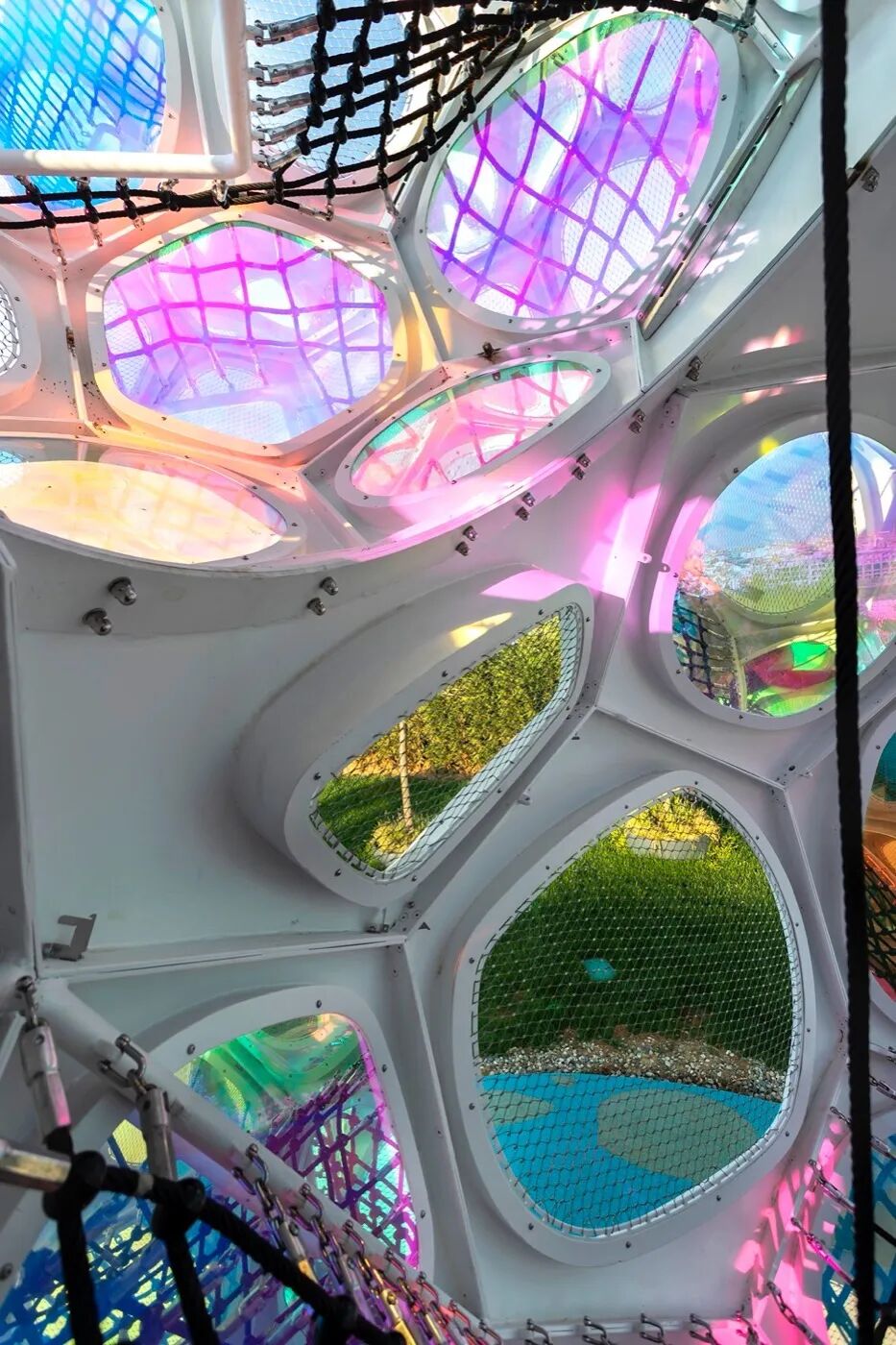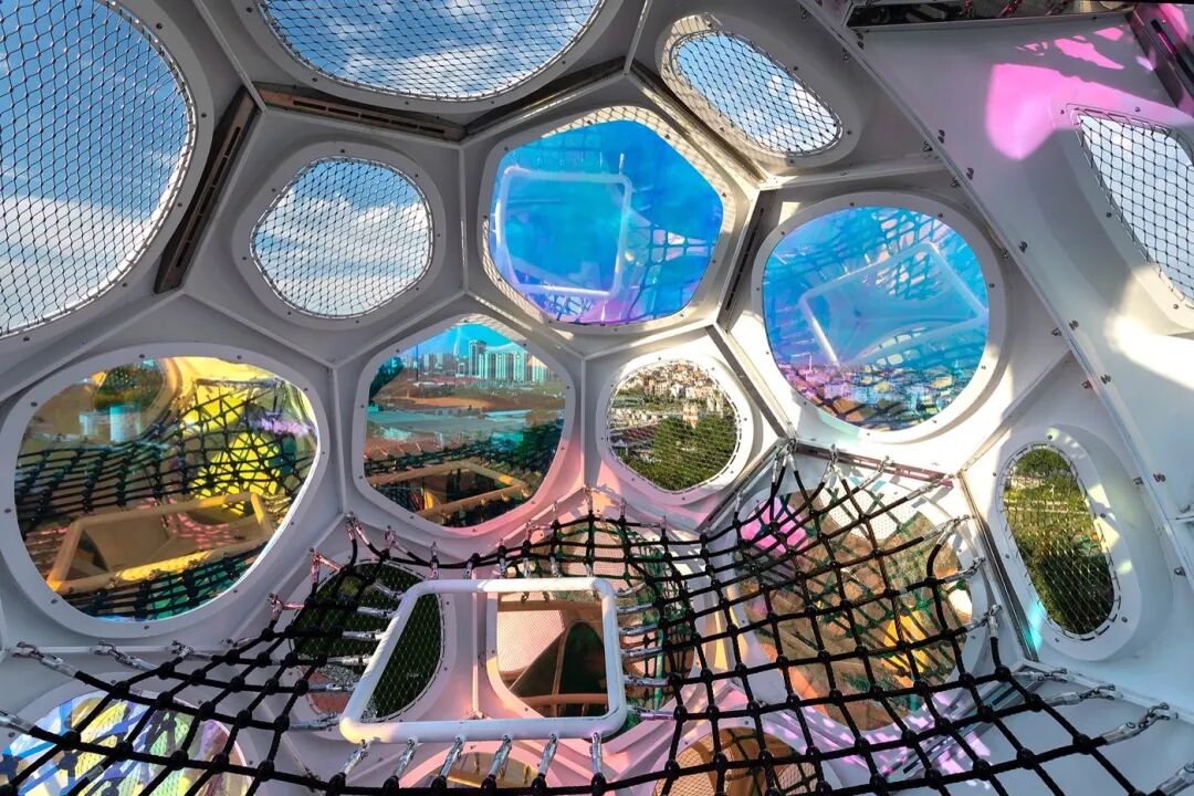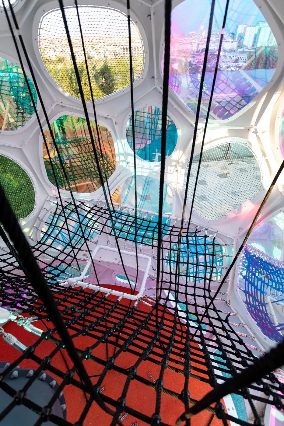 从街道上往下看24米,你可以看到阳光在白色的游戏结构上闪闪发光,而二向色窗则为“泡泡”的内外增色不少。