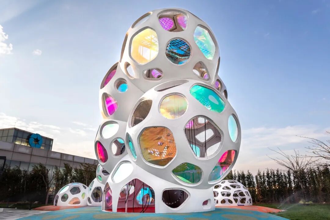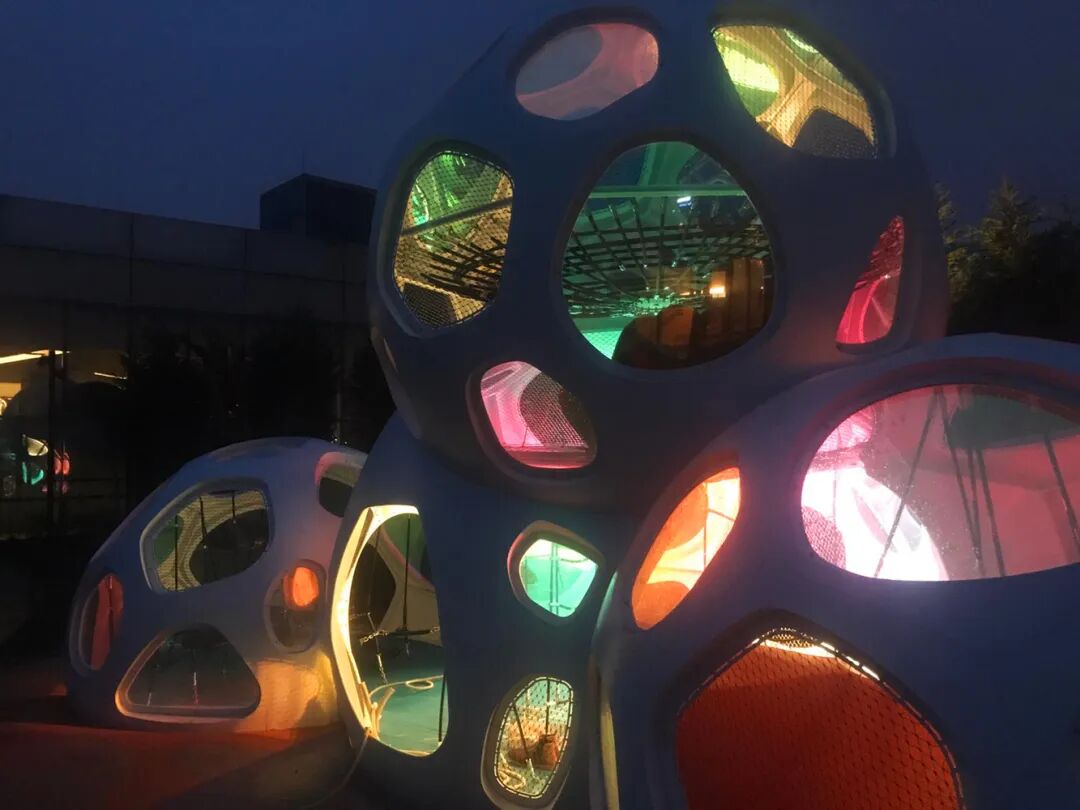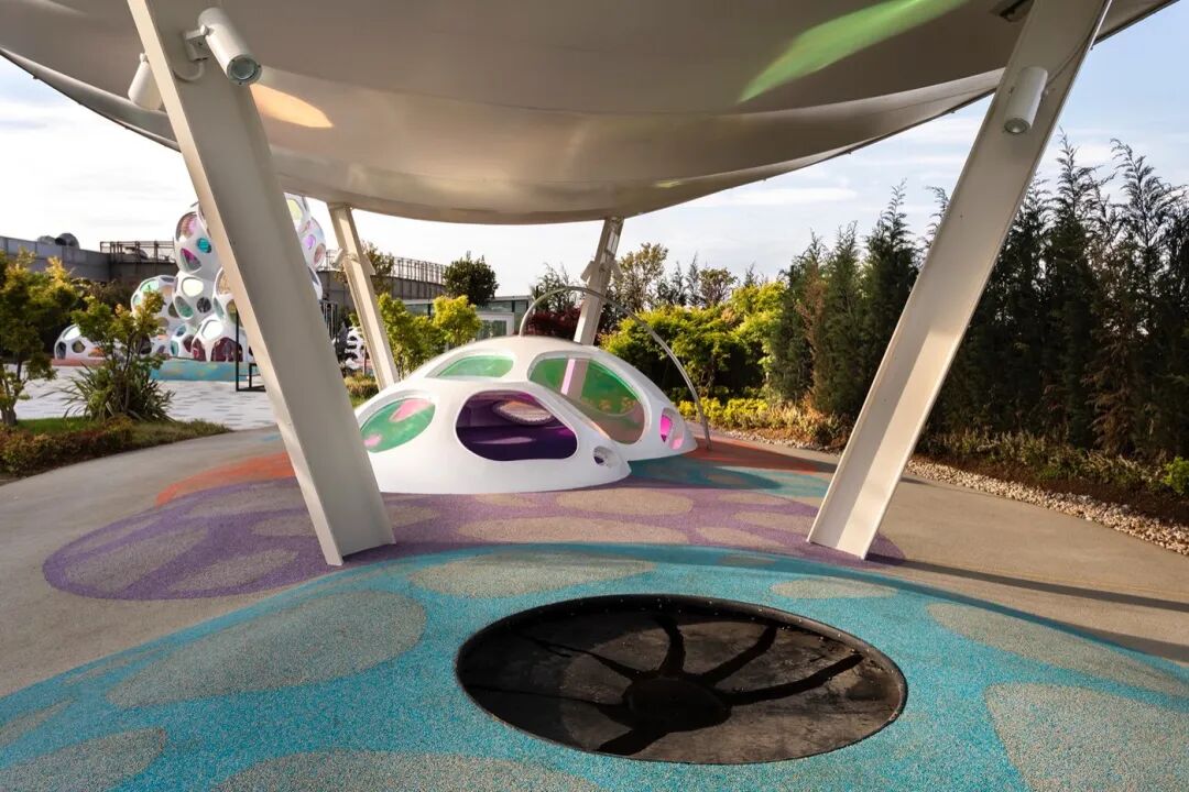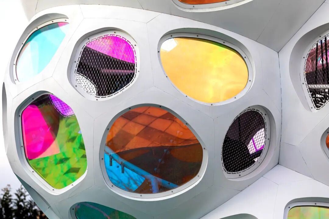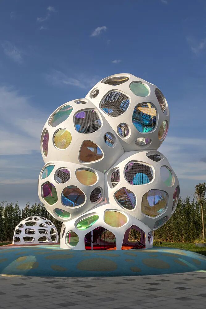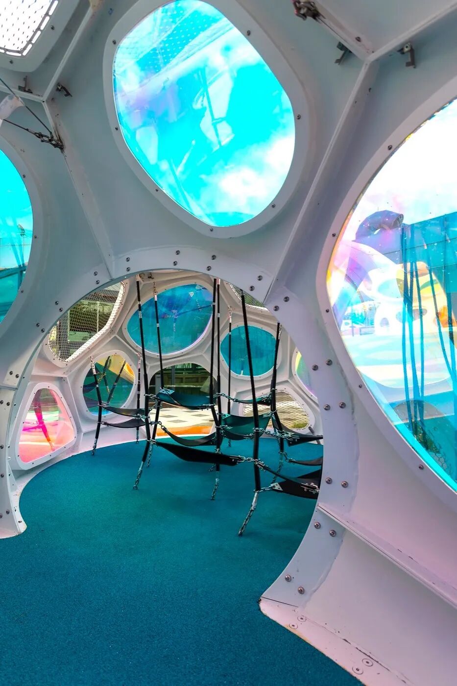 从街道上往下看24米,你可以看到阳光在白色的游戏结构上闪闪发光,而二向色窗则为“泡泡”的内外增色不少。