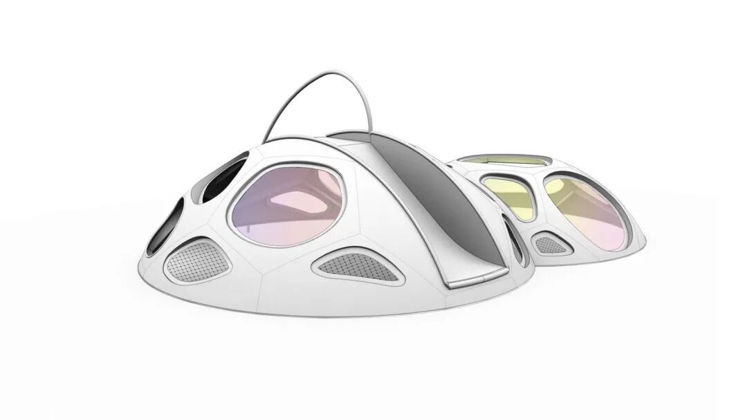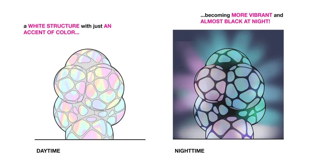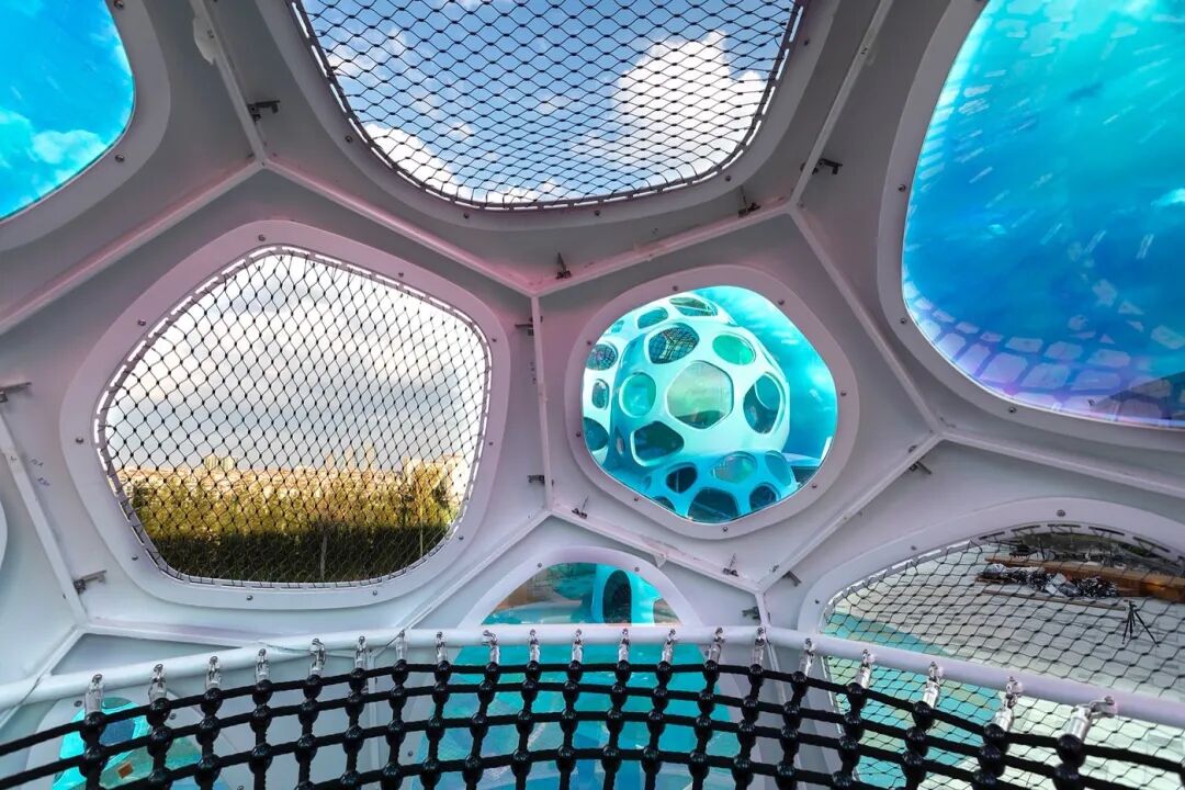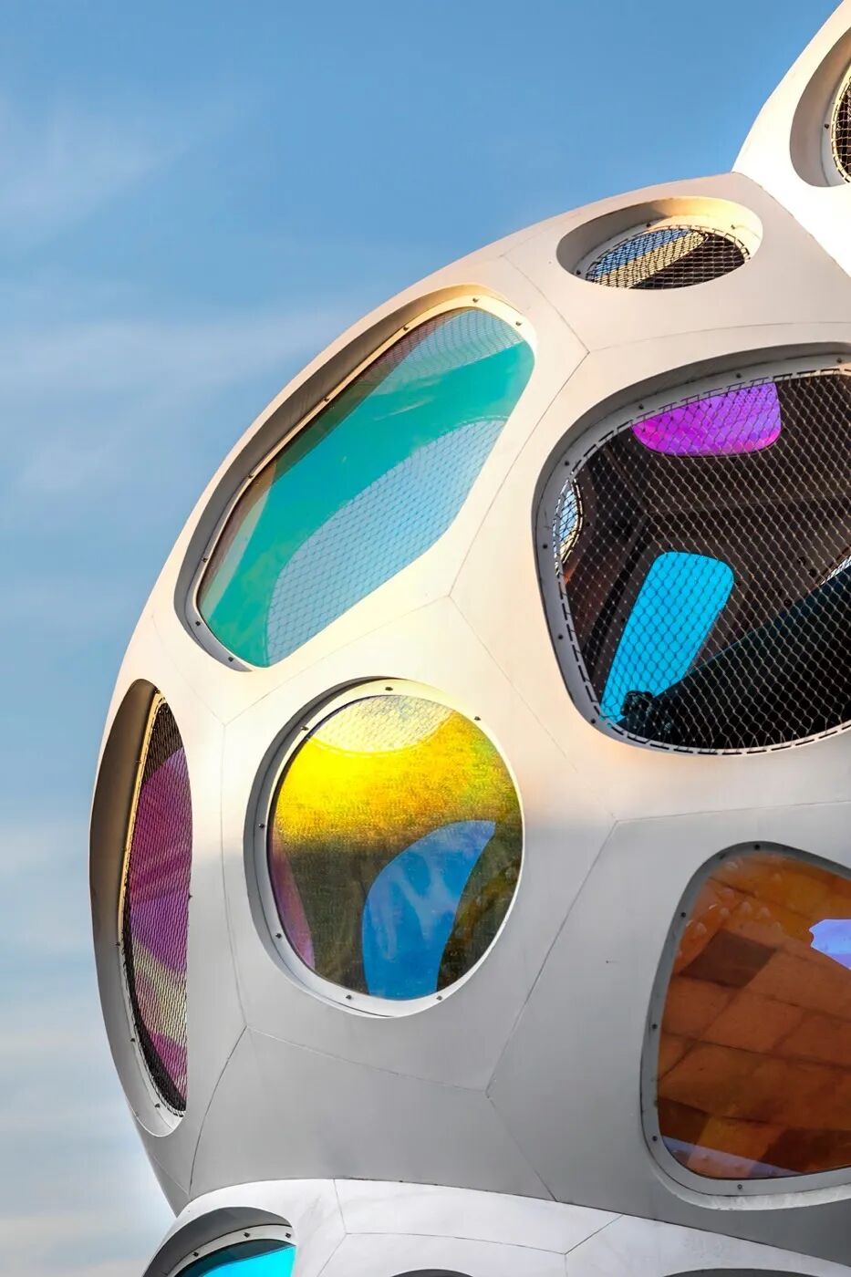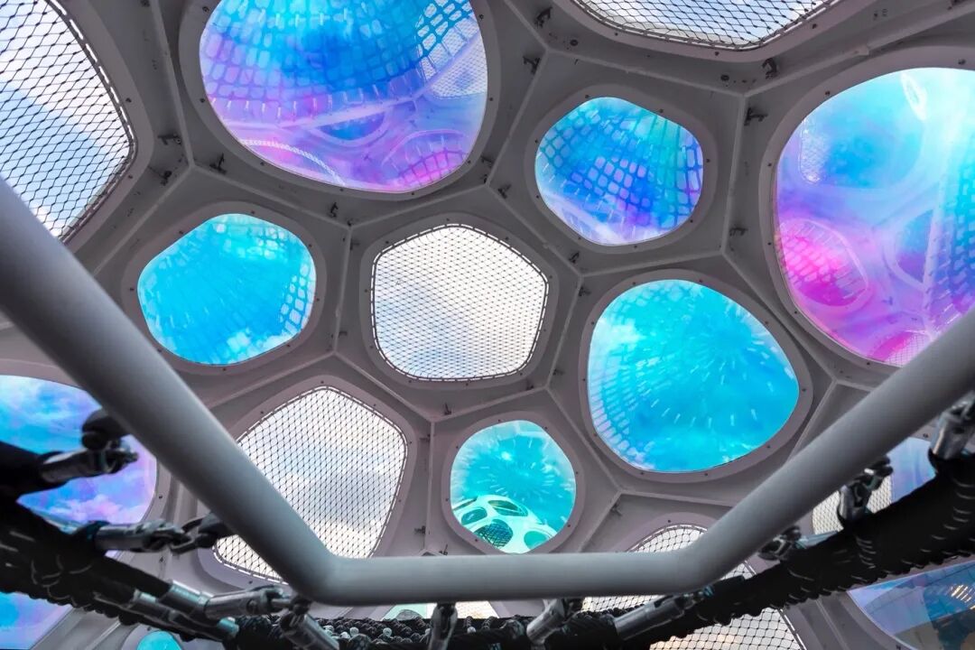 从街道上往下看24米,你可以看到阳光在白色的游戏结构上闪闪发光,而二向色窗则为“泡泡”的内外增色不少。