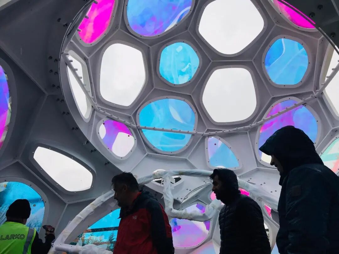 At night the Bubbles make an intriguing spectacle of lights. Light radiates from behind the window frames turning the Bubbles into a beacon that can be seen from the surroundings.