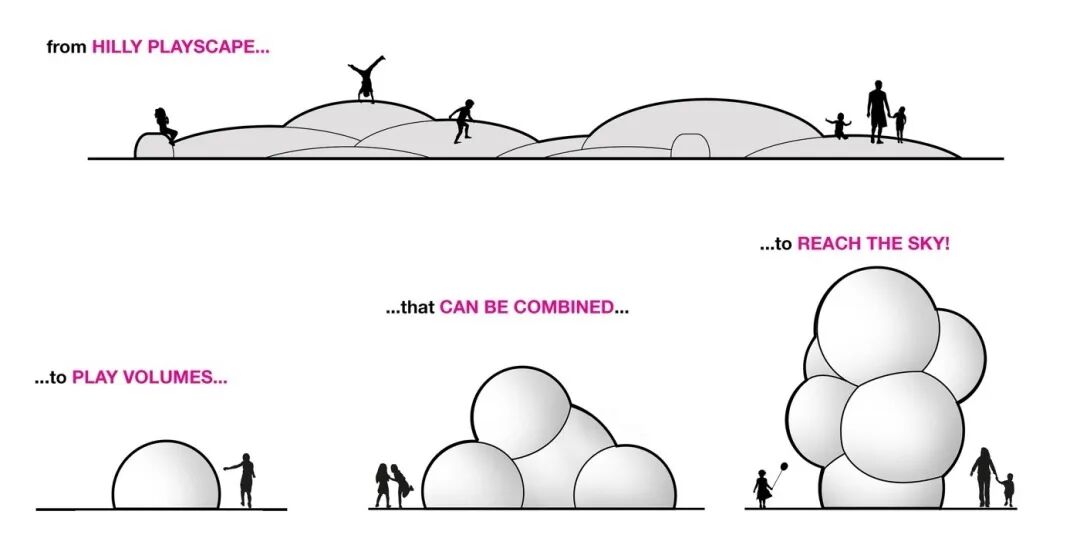 There is a toddler space, a climbing dome, a larger ensemble of spheres and a near eight-metre tall climbing tower with an internal slide.