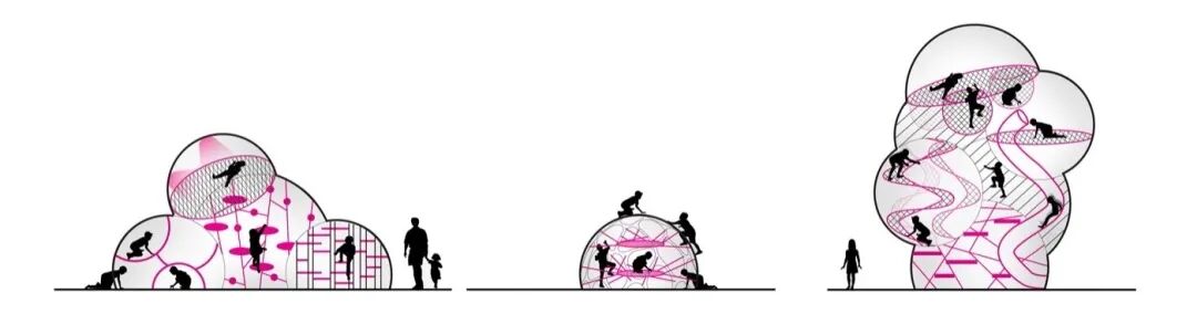 这里有一个幼儿空间、一个攀爬圆顶、一个更大的球体组合和一个接近8米高的带有内部滑梯的攀爬塔。