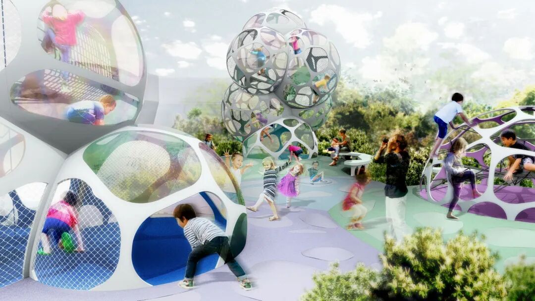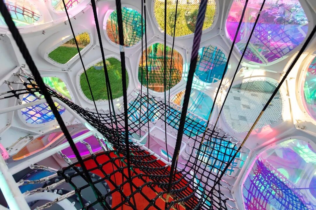 孩子们可以在吊床森林中休息、攀爬、滑行,还可以从窗后眺望城市天际线体验高度。