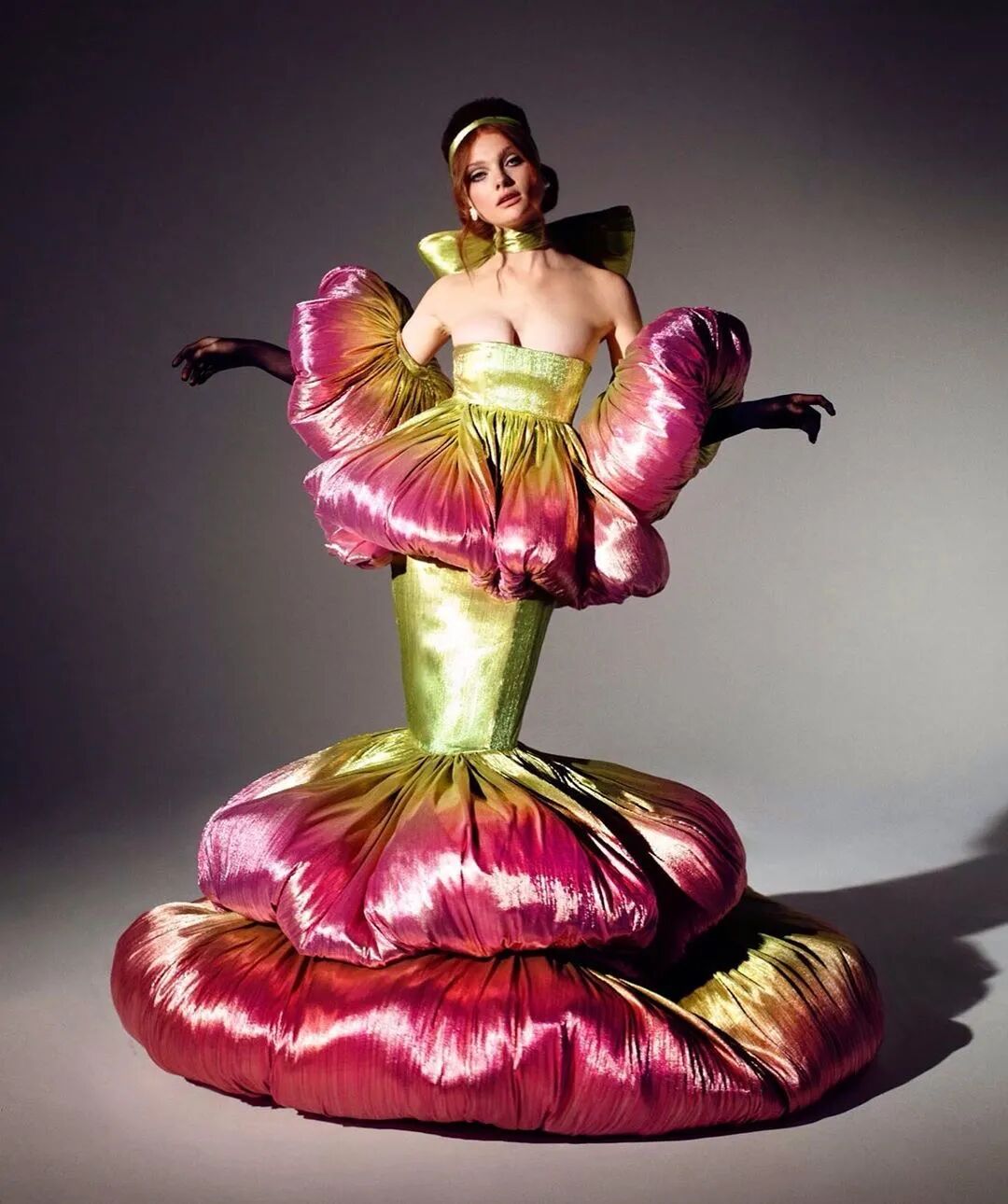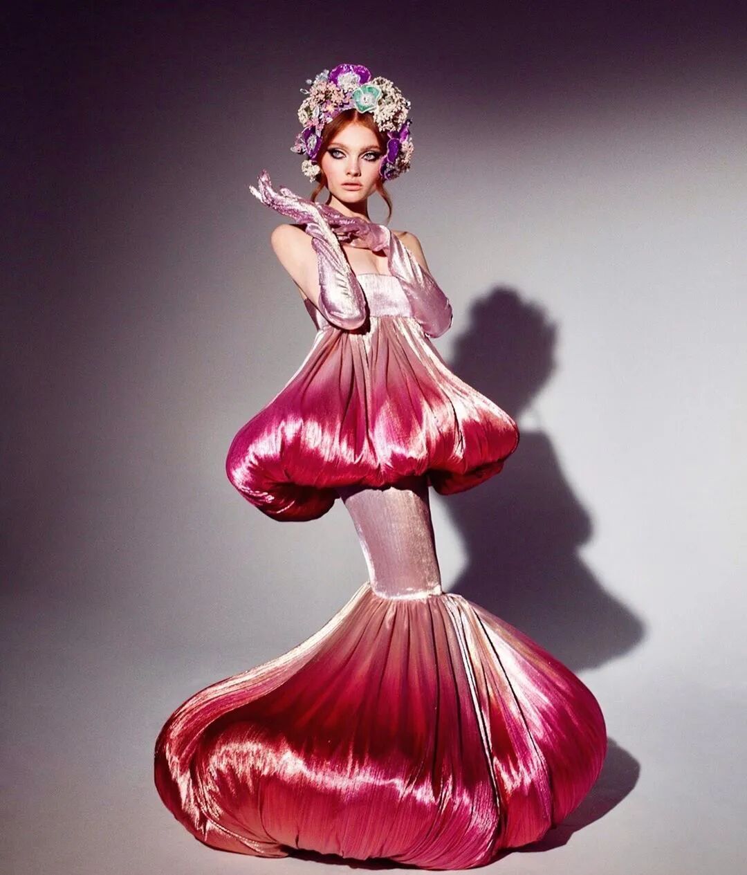 Sohee的毕业设计系列,灵感来自一个女孩成长为成熟女性的概念,以错综复杂而富丽堂皇的花卉服装的形式展示她的反乌托邦世界。这是一个“浪漫,迷人的世界,充满幻想的花香,美丽优雅的女人穿着粉红色和紫色贵宾犬穿着华丽的礼服走上街头”Sohee这样形容。