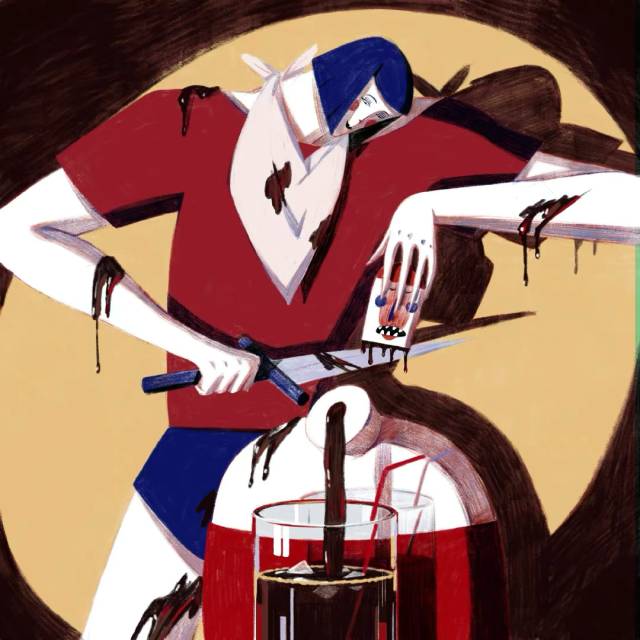 “《Coke Killer》灵感来源于非常爱喝可乐的室友。喝可乐成瘾的她终于成为了一名职业可乐杀手,她每天都要杀掉至少一只可乐,她把他们的头看下来,让美味的可乐从脖子流到杯子里,她喜欢加冰块,这会让可乐的血尝起来更加美味。”
