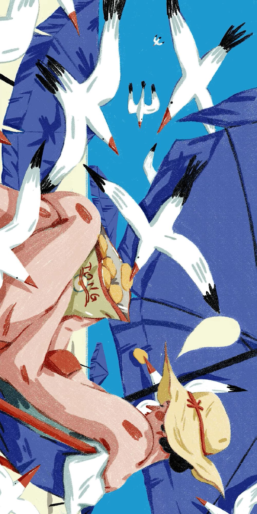 沙滩上晒太阳的少女,惬意地睡了过去,一群海鸥悄悄逼近,偷走她怀里的薯片;