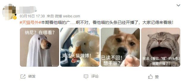 依托于内容本身,网友也在视频下方进行评论,同时也在#天猫号外#话题下制作了各种有趣的内容,将节目以表情包的方式进行推荐,从而吸引更多的人关注,同时还能将幽默的属性赋予到节目本身。