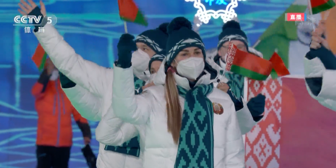 除了头顶的帽子,颈间的围巾一样很吸睛,白俄罗斯的民族花纹围巾灵感来自国旗左侧的花纹竖条,绿色象征未来和希望。