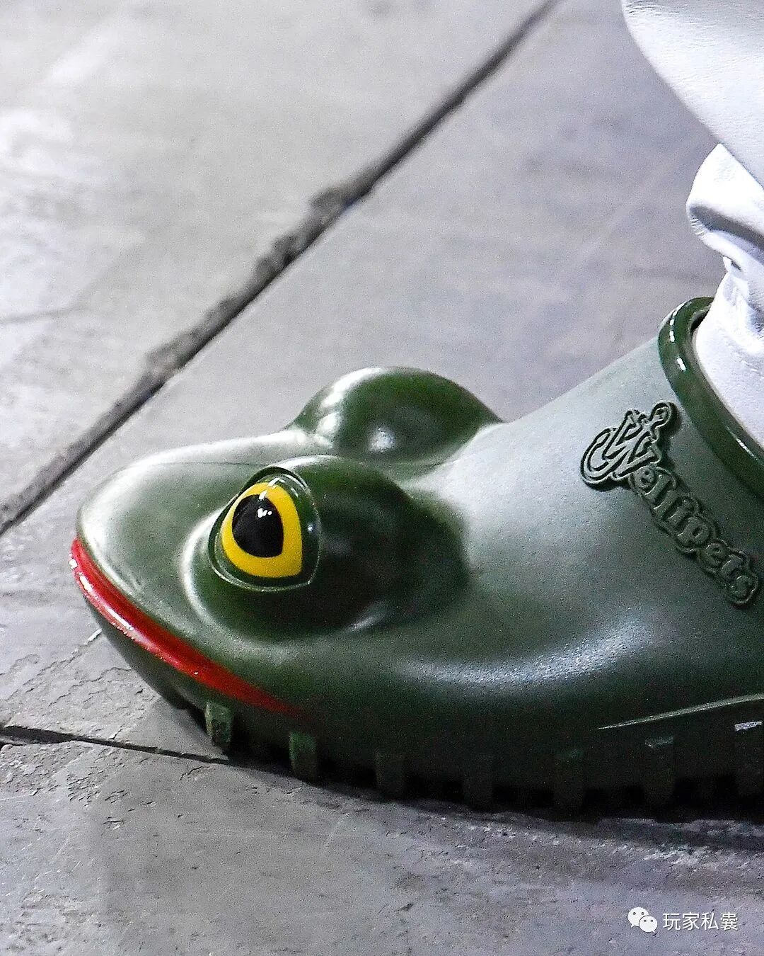JW Anderson和英国雨靴品牌Wellipets合作的这个青蛙鞋,威廉王子小时候也穿过,高筒雨靴的样式比这个好看到不止一百倍。
