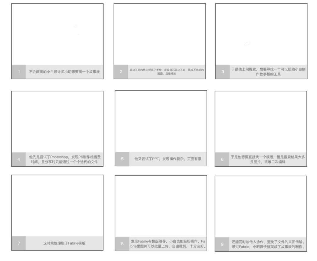 总结一下,故事板其实就是用直观的画面和简单的文本来综述用户与解决方案的交互故事,是一个引导、阐述、组织和验证需求的过程。用了fabrie,不用害怕画功不好~
