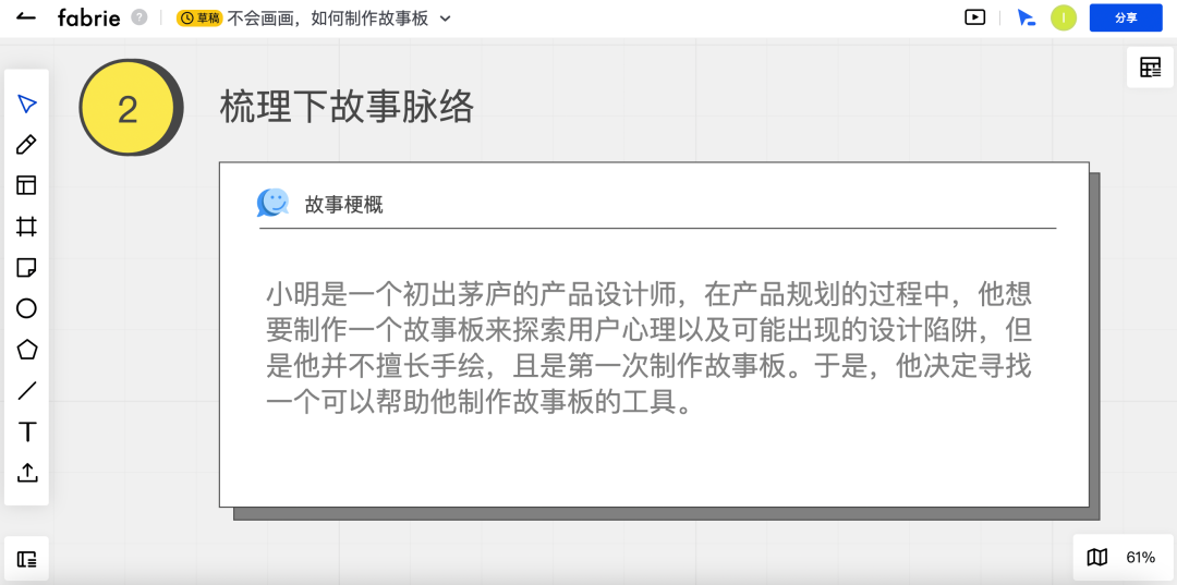 对于这类情况,我想分享一个自己在用的设计师工具——fabrie文档,一个专门面向设计师的在线协作工具!即使你的绘画基础相对薄弱,或者说你是第一次制作故事板,它都可以帮助你高效、便捷地进行故事板制作!(当然也有相关模板可以直接套用~)