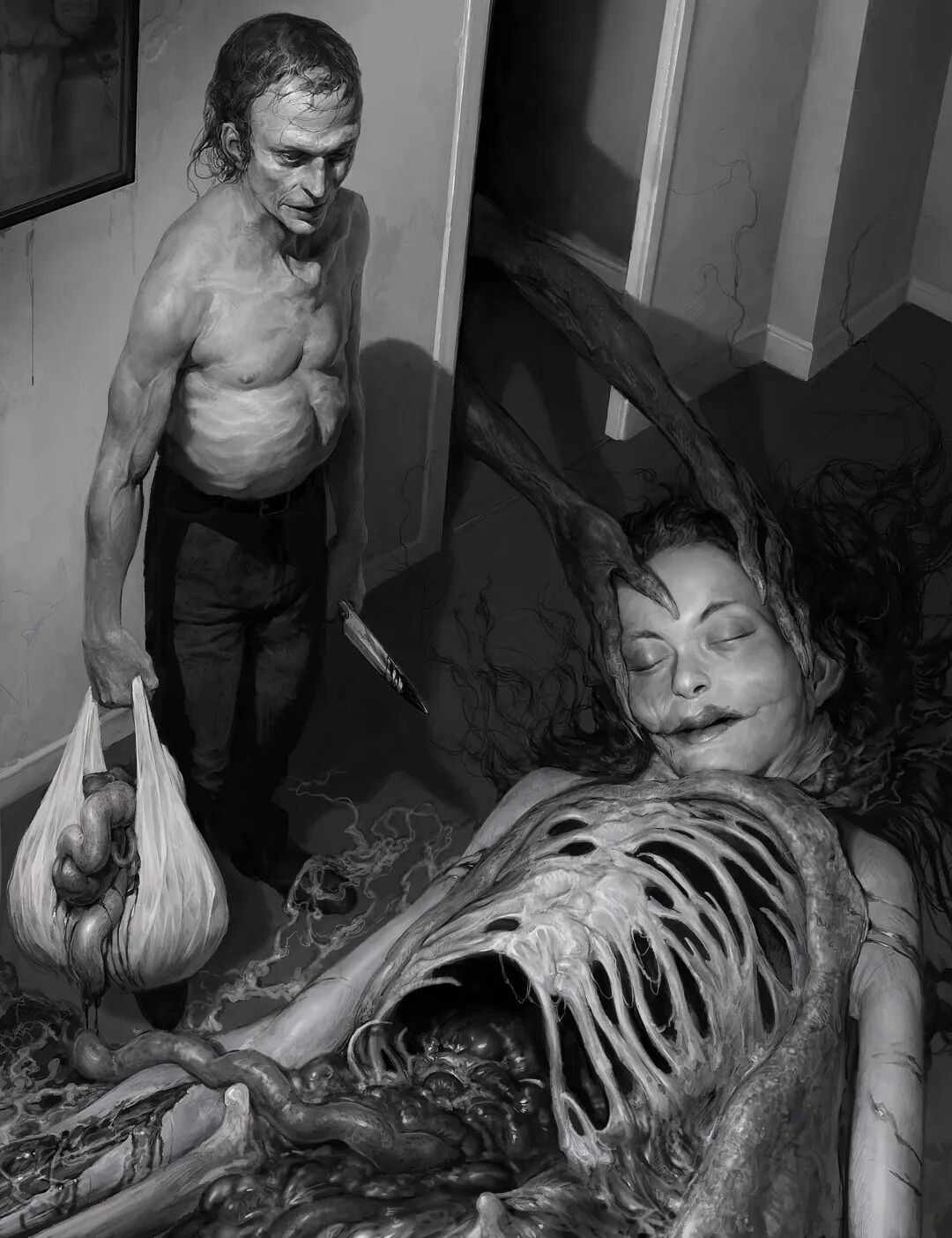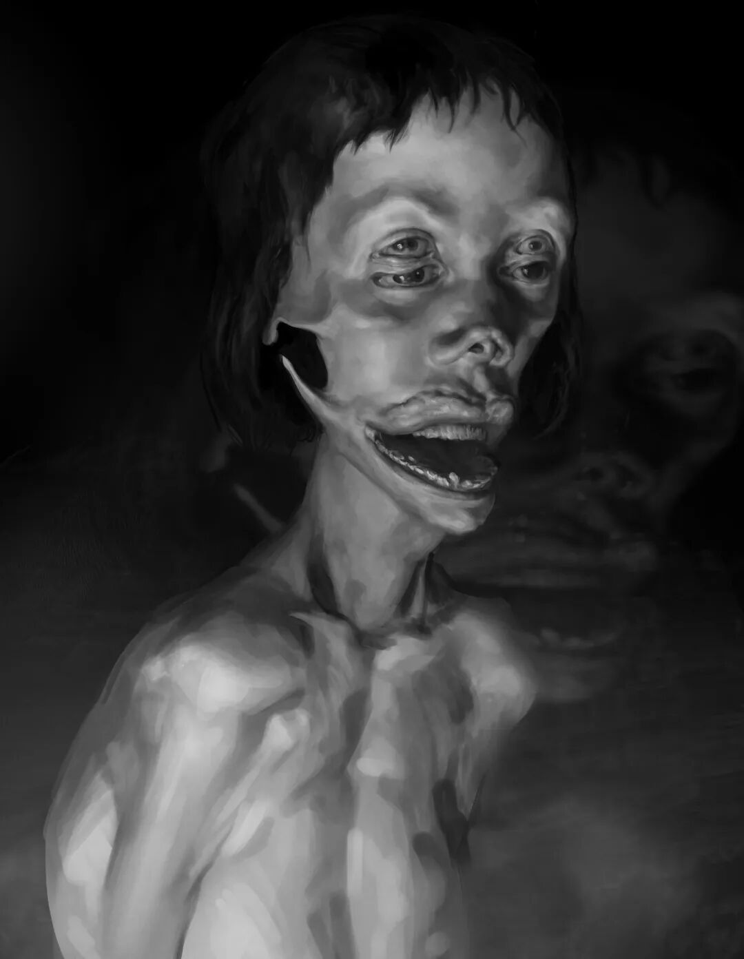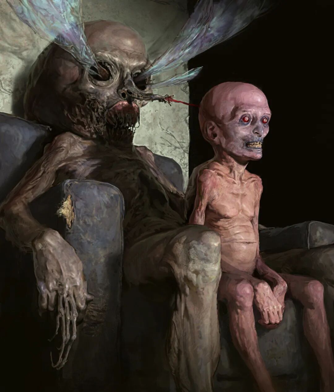 Dan Peacock的作品曾被收录到《Evilbook2》画集当中,他的个人作品主打猎奇恐怖风格,畸形错位的肢体以及比例诡异面目模糊的人形生物,都营造出强烈的视觉冲击力,甚至让人感觉到生理性的不适,但在疯狂掉san值得同时,他的作品也确实充满了对于未知之物的想象和探索,不得不惊叹于他疯狂的想象力以及扎实的绘画基本功。
