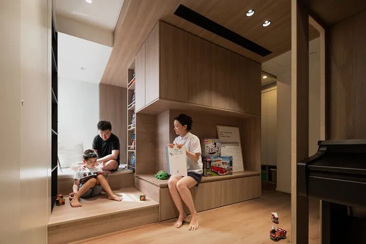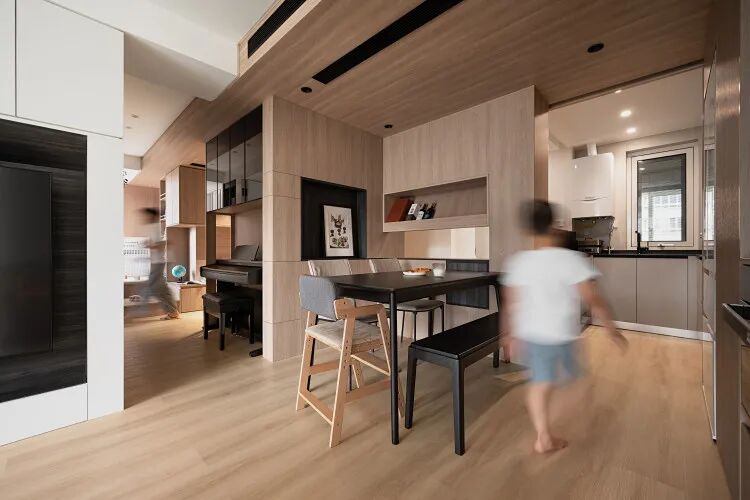 被动线串联起来的各功能节点,视线通达,阅读区、钢琴区和餐区形成一条视线通廊,父母和孩子可以随时观察到彼此的状态和活动。