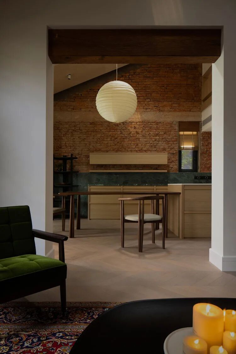 材质上,餐厅部分裸露的红砖与祖母绿石材形成对比,木纹地板和几何形拼花的地砖也凸显出房子的历史专属性。