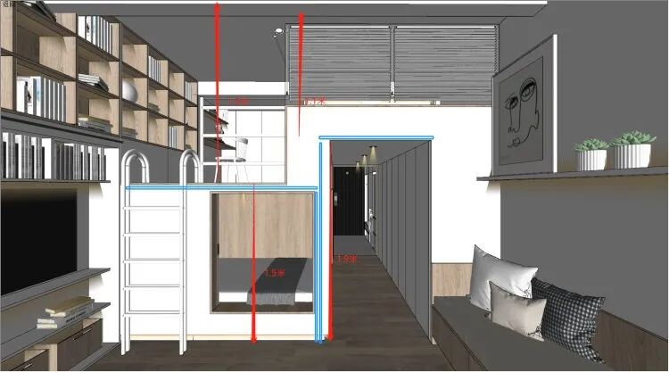 过道设计1米9,3米的层高一分为二,过道和阁楼均可满足正常活动。同时利用40公分的高差,在阁楼二层设置休息的坐榻。除卧室外,二层还设有书桌和储物柜,满足女儿日常的学习活动。