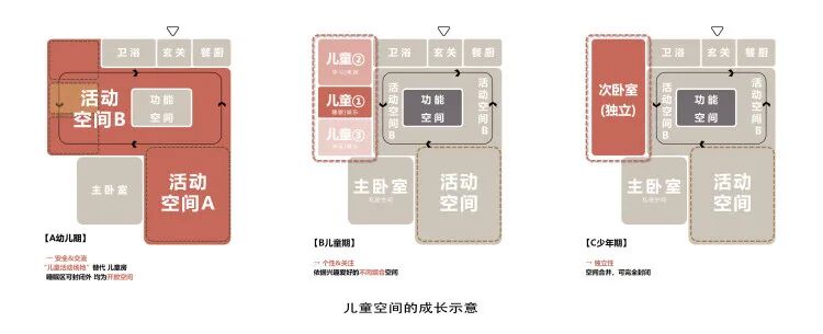 为了满足孩子在不同年龄阶段需求的变化,顽鄙设计摆脱儿童房的传统概念,规划了不同使用场景下的空间形态