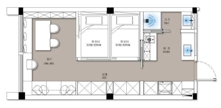 首先改变入户门位置,让出卫生间的区域,由于没有排污管道,所以无法设置马桶,但洗手洗衣等清洁功能可以在室内完成。