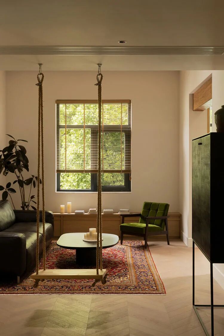 家里的装饰物品是居住者风格的延伸,自然清新,具有特色。客厅中,绿植和自然材料包裹间,两只跳色单人沙发的组合让空间氛围活跃许多。