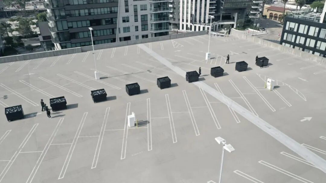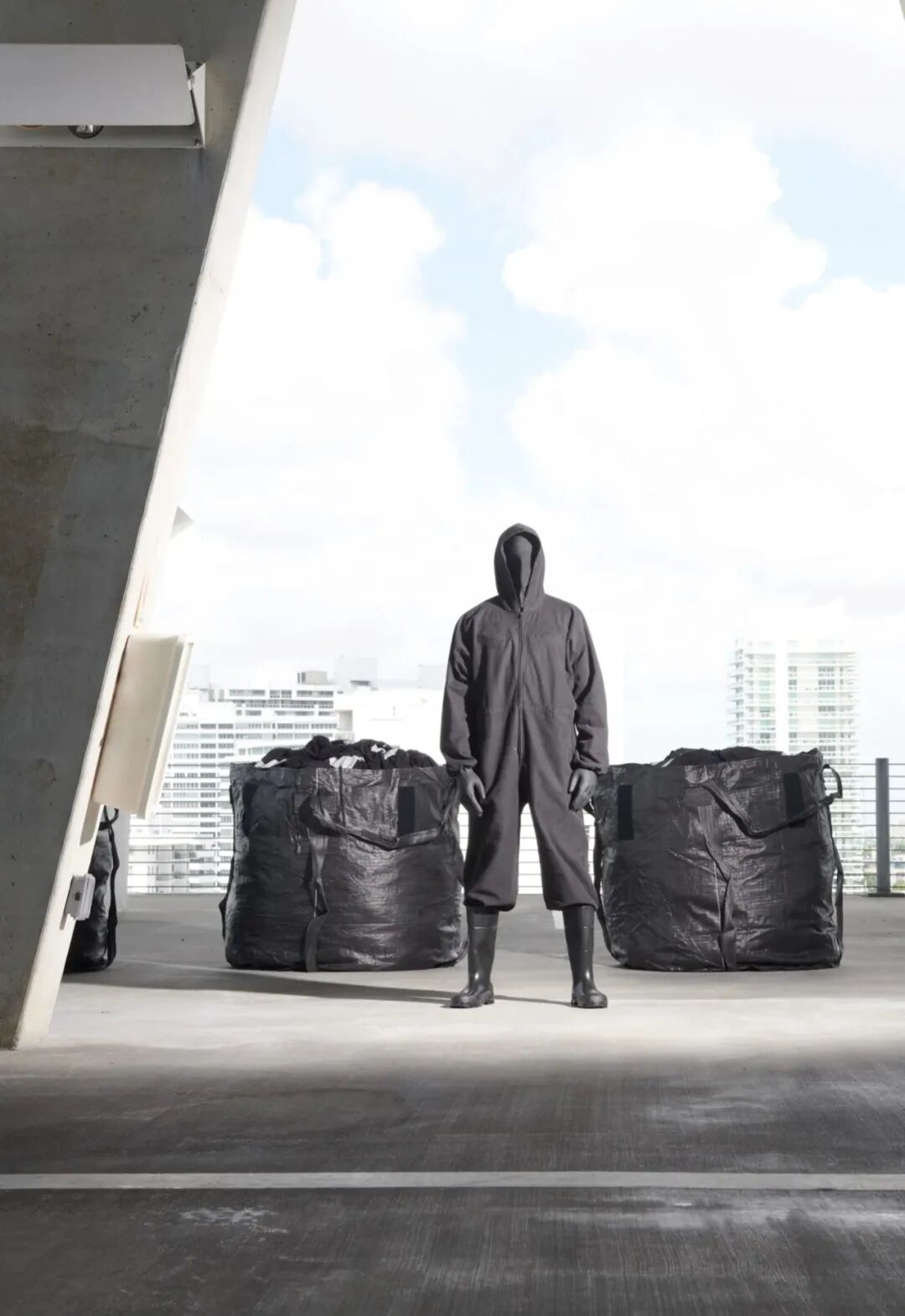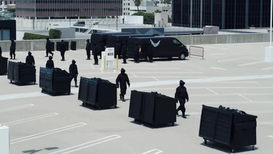 备受期待的第二款 Yeezy Gap 在多个快闪活动上推出,其中一个在 Herzog & de Meuron 位于林肯路 1111 号的多层停车场内举行。混凝土停车场的一层有 20 个黑色的散装袋,是那种通常用于运输砾石和建筑材料的袋子,里面装满了这个系列的产品,并在停车场内排成一排。在其他地方,涂黑的垃圾箱被用来装大量的衣服,迫使顾客在垃圾箱里翻找货物。
