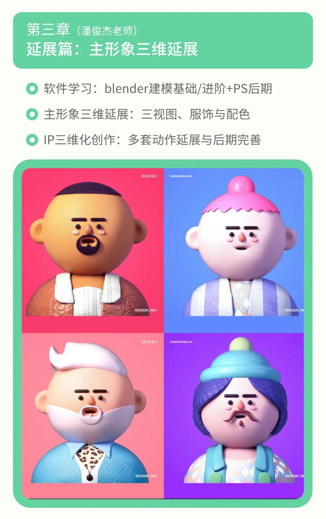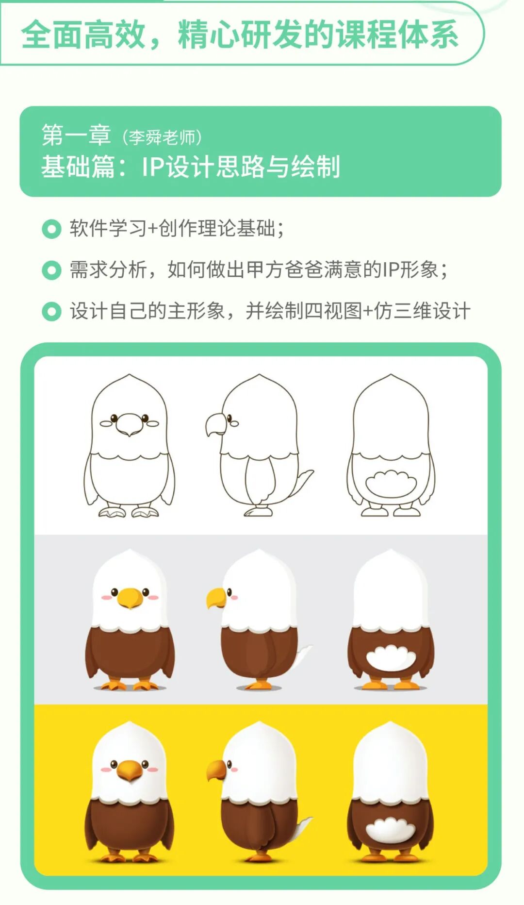 这里我想分享下老师上课讲的一些内容,比如在设计主形象的时候,李舜老师会把每一个五官怎么去设计讲的很详细,比如眼睛就分为:黑豆眼,大圆眼,突出眼,其他等,每一种眼睛适用于哪些条件。其他的五官同理,李舜老师是有套方法论去教你们如何设计出具有识别度的IP。李舜老师有非常丰富的项目经验,会告诉你们如何理解IP设计的需求,包括有品牌,为品牌定制IP;无品牌,为甲方/自己设计IP;以及有IP为IP升级的这些需求如何去设计。