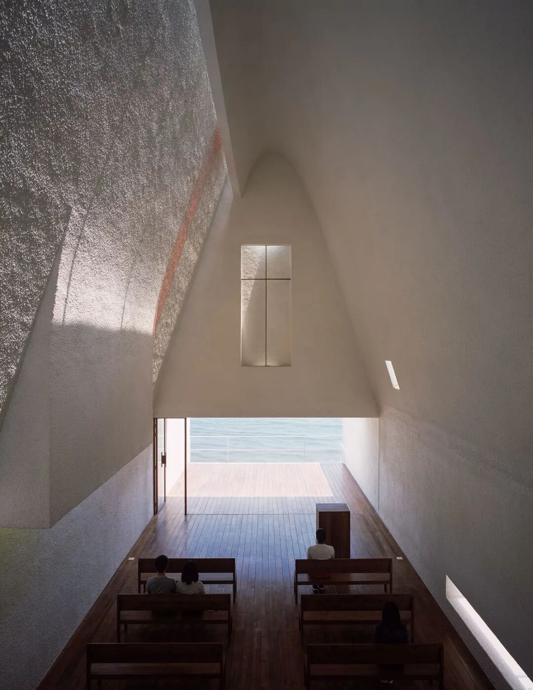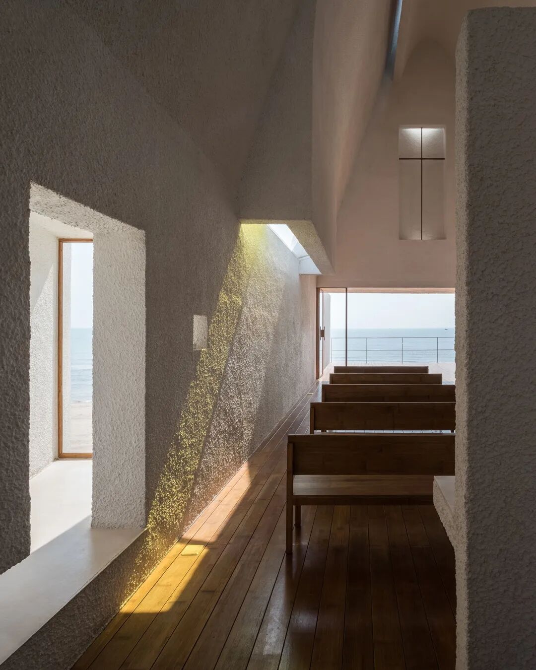 而上层是一个属于宗教的空间。拾级而上,进入大门,再绕过影壁,最后进入一个面向大海的教堂空间。由于空间被抬高的原因,在这里人的视野里没有沙滩和沙滩上的人,只有对面一望无际的海面。