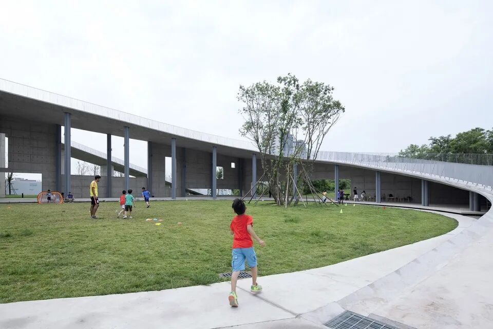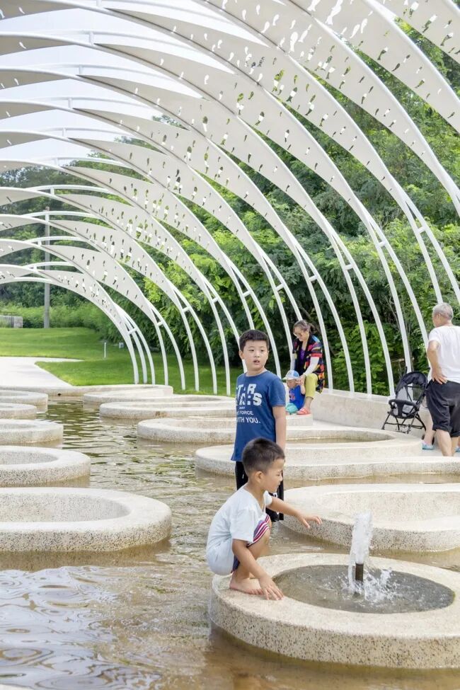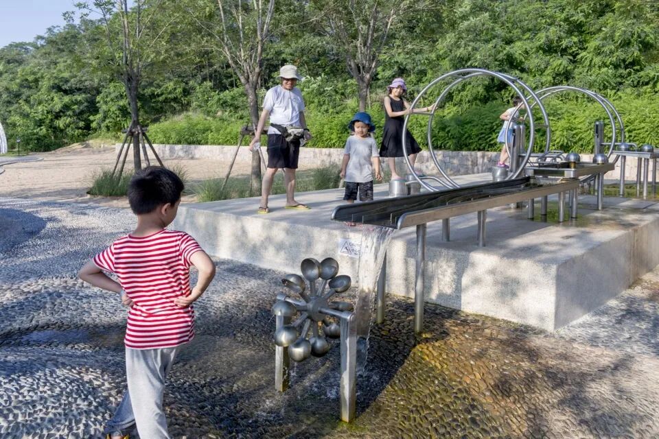 活动乐园从《山海经》中提取灵感,设计了鱼骨亭、鳗鱼长凳、海星花田、攀爬海螺和五爪章鱼滑梯等具有动物形态的互动景观元素,给场地赋予了独特的记忆点,又能让游人享受与景观元素的互动,在玩耍的同时学习有关动植物、农业灌溉的知识。