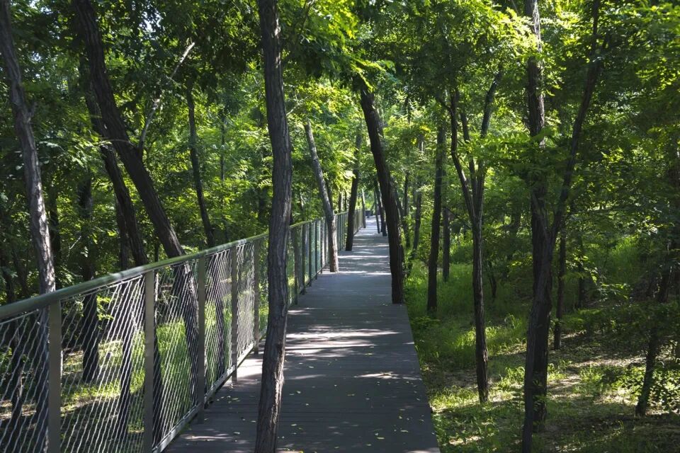 林中场所设计了简洁的木栈道和捕捉光影的亚克力屏风,让人们在林中散步的同时,感受自然界光与风的变化。