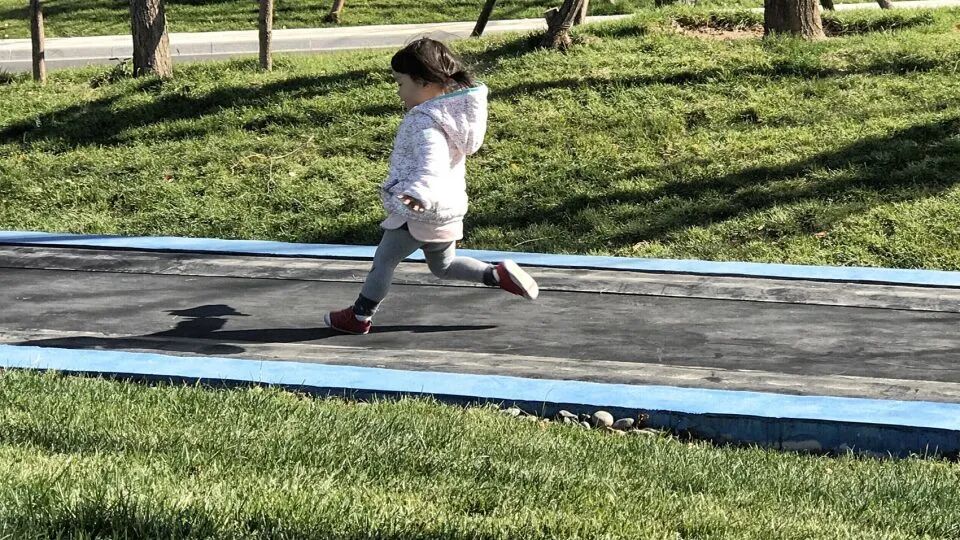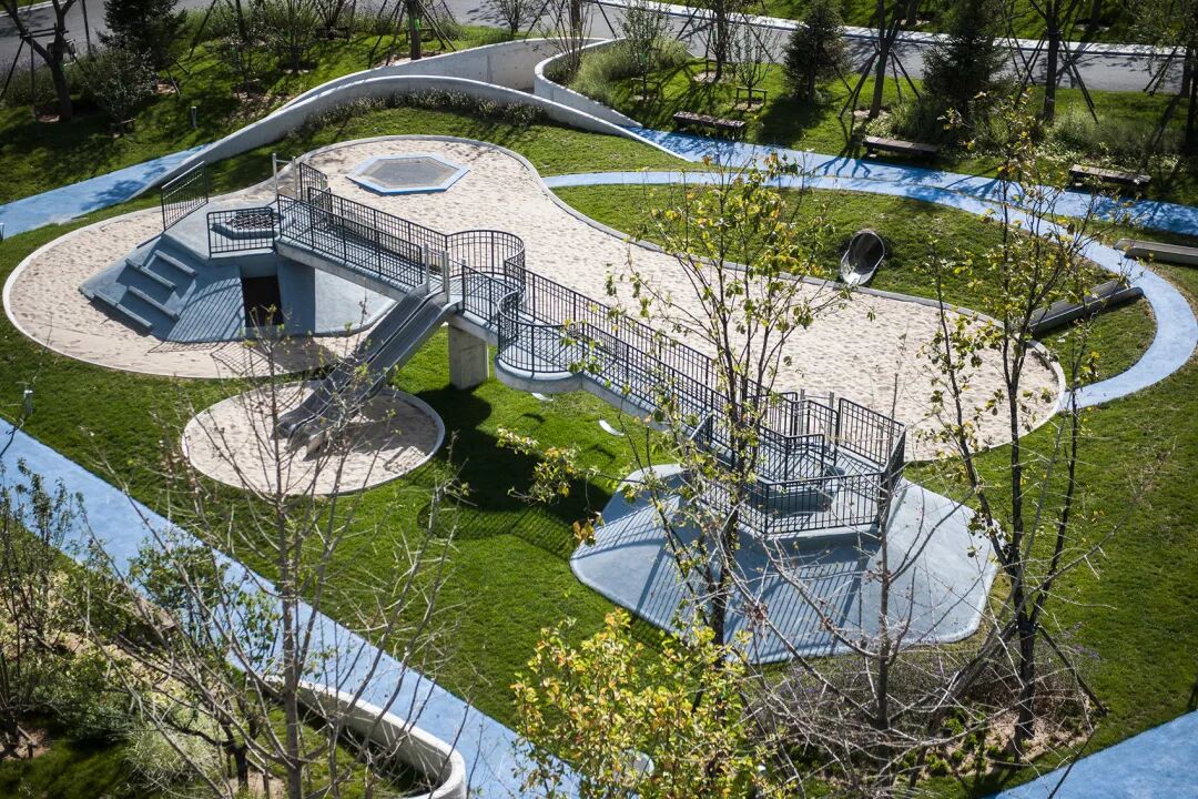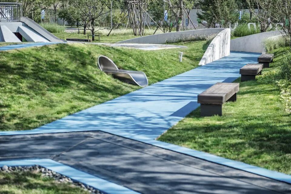 以混凝土素色和天蓝色为主要基调的儿童活动场地,突破了以往儿童空间设计中颜色堆叠的思维惯性,尝试以最素色简约的设计理念还原孩子对世界的探索与感知,是一个极具个性化的儿童活动空间。考虑到儿童天性好动以及肌肤娇嫩等特点,仿混凝土质感的软性塑胶材料将这一设计理念完美呈现。围绕场地中央的儿童城堡,建有一条中国最长的80m户外儿童蹦床跑道,孩子们可以在这里跳跃、奔跑、滑行,尽情享受摆脱大自然重力的畅快和愉悦。