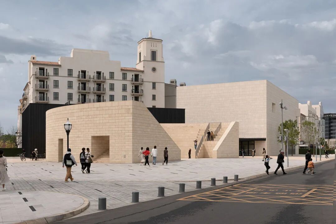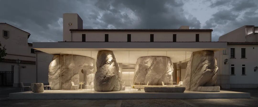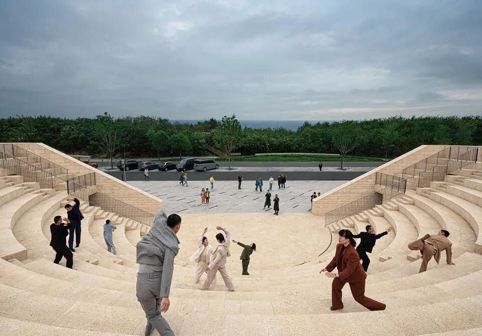 酒神剧场以一种开放的姿态,打破了剧场建筑的封闭性。面朝大海,半圆形的建筑姿态是对古希腊戏剧传统的致敬,海底的珊瑚化石精致切割后,上面的点点斑驳,是折射调音的孔隙,更是大海在此停留的印迹。