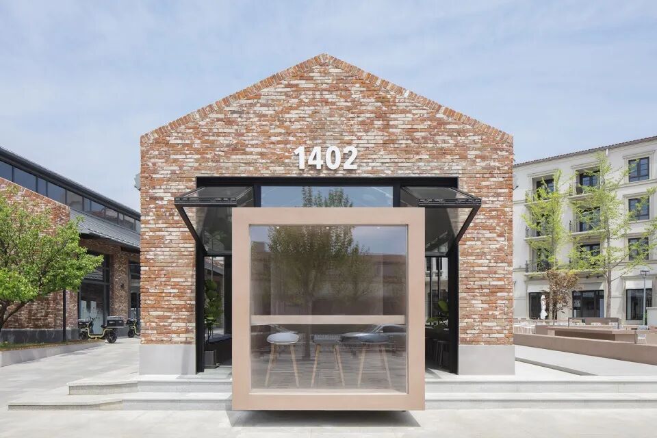 1402咖啡店项目地址位于阿那亚社区内西门通往海边的主路一侧。咖啡馆外立面以通透的大玻璃为主,面向广场一侧的电动折叠门及面向外摆区的折叠窗,在室外天气宜人的时候都可以完全打开,让室内外连通增加互动。