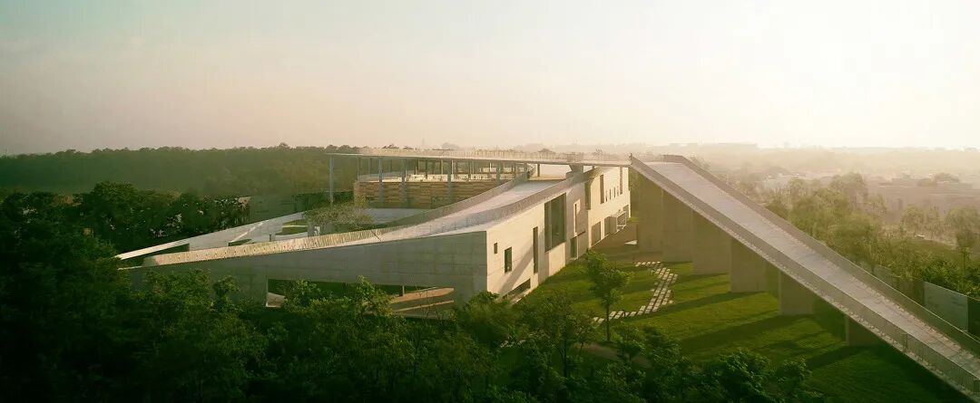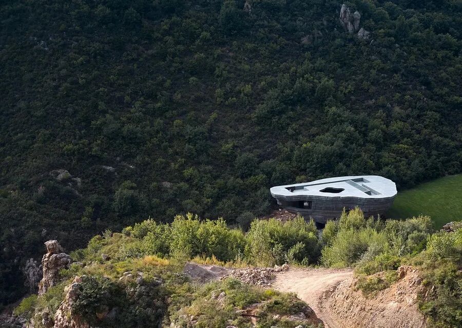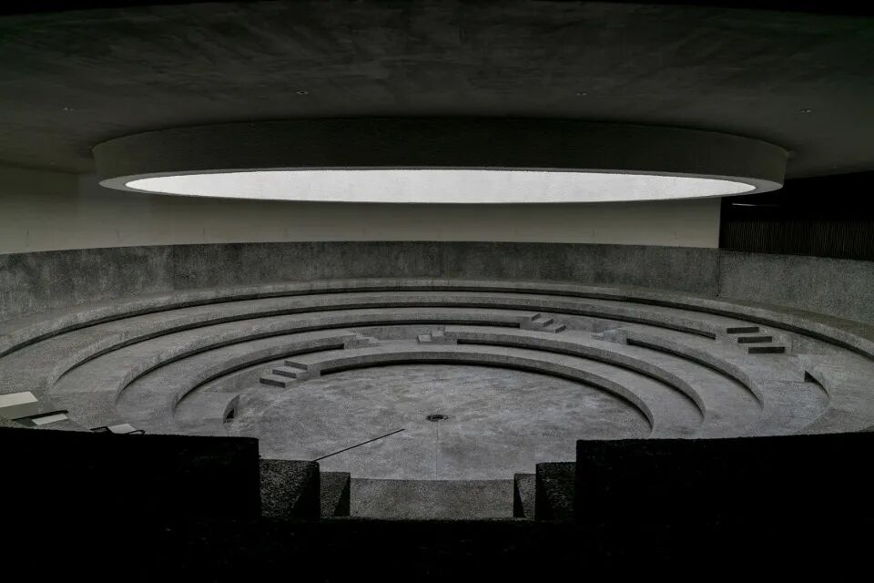 整个音乐厅呈倒锥形设计,如同一块天外飞来的巨石,遗落在山谷。纵深约13米,仿佛从地下生长出来。巨石洞穴里,半露天的剧场、室外舞台、观景平台,让音乐与生活相连。设计师表示:“这是一座由声音出发、由内而外雕刻而成的建筑。我们称它为Chapel of Sound,希望人们可以‘看到’声音的形状,或者‘听到’寂静的声响。”