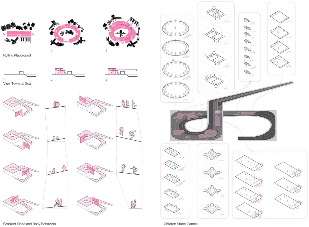 连续的坡道形成了一系列在其之上和于其之下的活动空间。在靠下的部分,坡道成了一个环绕庭院的临时观众席,并在其下形成了舒适的户外空间。用于支撑坡道并围合空间的混凝土墙上打开了若干巨大洞口,形成朝向沙丘景观和游戏场地的取景框。在中间部分,坡道顶部可远眺大海并鸟瞰阿那亚全景,而在其之下则是一个平坦的儿童游戏空间。在结束部分,坡道迅速的下降,与地面上的儿童游戏场地相连接。