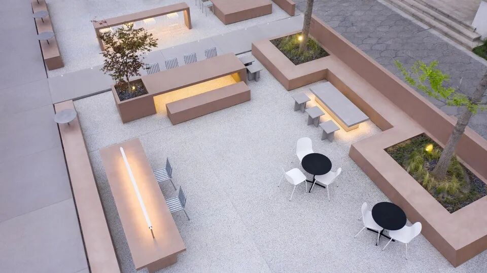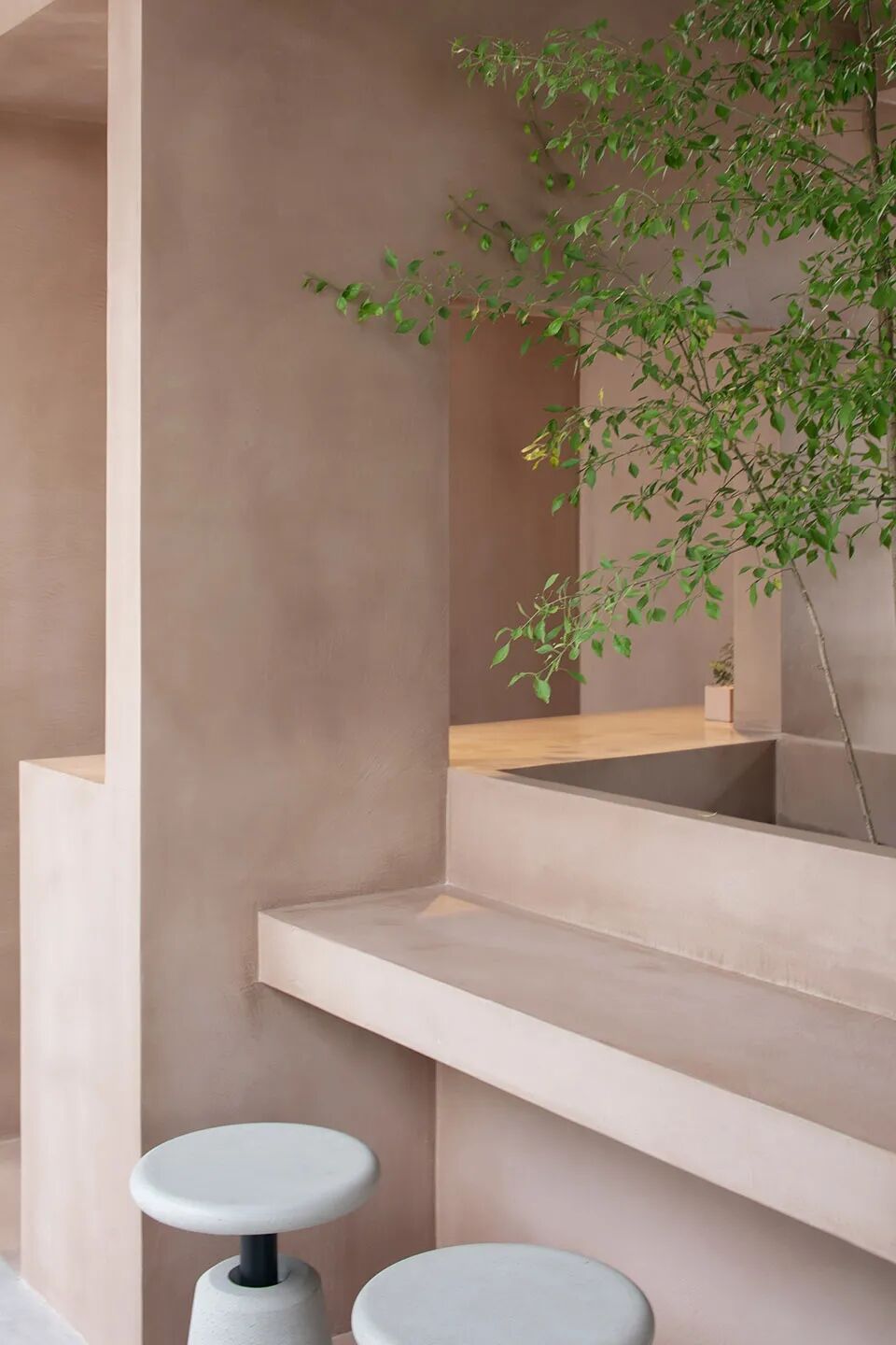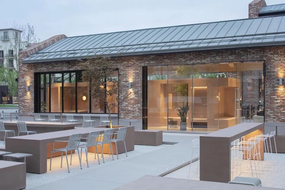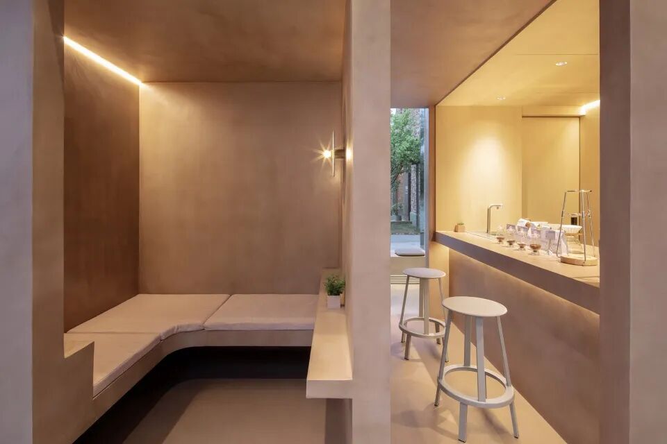 咖啡店室内部分,设计师打破传统咖啡馆公共大空间的布局方式,将客座,等候区,手冲吧台,景观,产品展示等功能结合而成一个新的咖啡体验“盒子”插入到原有建筑之中,把原本一览无余的空间进行了分隔,形成更加多变的咖啡体验空间。茶色混凝土盒子从红砖建筑的临街立面延伸而出,赋予了原本规则的建筑外立面新的视觉焦点,激发客人进入探寻的好奇心。