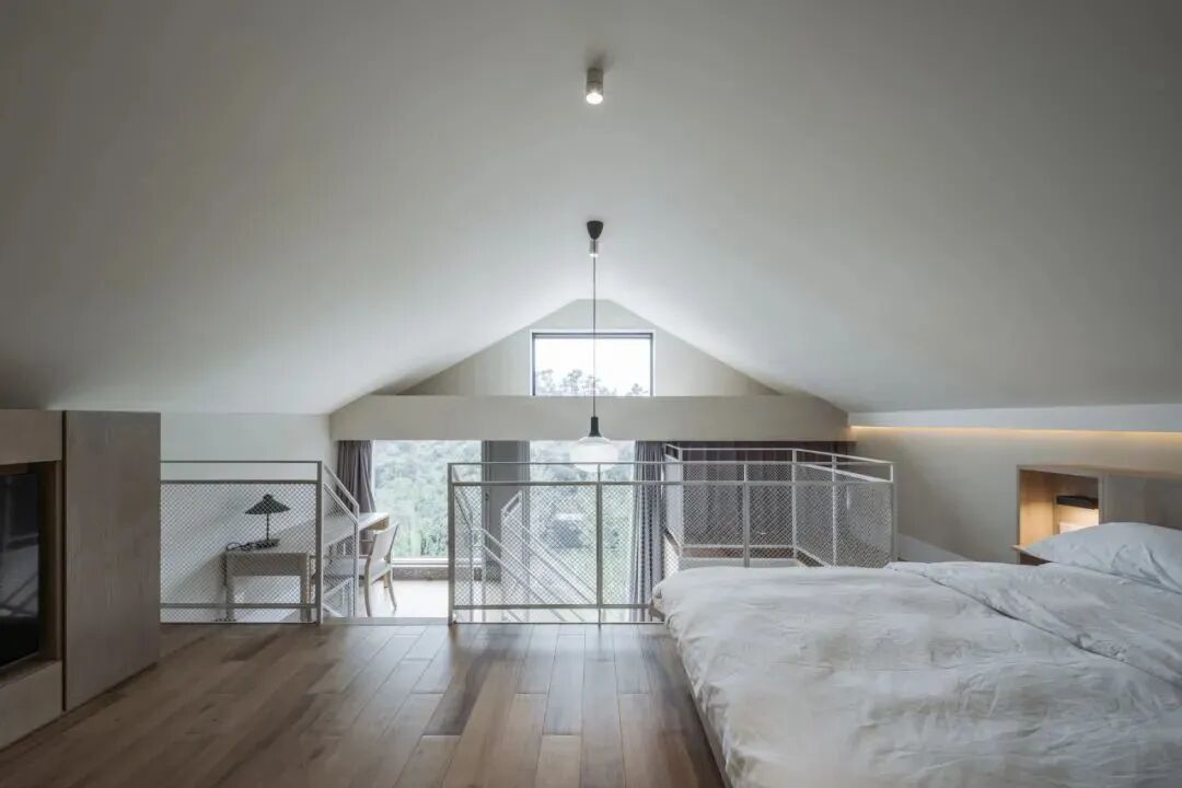 建筑首层主要为民宿接待中心及相关配套,为游客提供入住办理以及咨询服务。接待大厅为两层挑空空间,保证了室内的自然光照,避免了人流量较大时的空间压抑感。建筑二、三层为员工办公中心,其中包含会议、办公和休闲活动功能。四、五层为度假酒店,总计54间客房。不同功能空间的垂直交通各自独立,在满足疏散要求的同时,尽量集约化竖向交通空间。