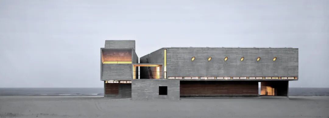 从沙丘美术馆内部看海,透过不同的洞口、在不同的时间里,大海都是不一样的风景。一部通往沙丘顶部观景平台的螺旋楼梯,引领人们从洞穴的暗处循着光线拾级而上,直到突然置身于天空与大海的广袤之间。在永恒的沙与海之间,建筑营造了一个隐匿的庇护所,将人的身体包裹其中,聆听自然与艺术的回响。