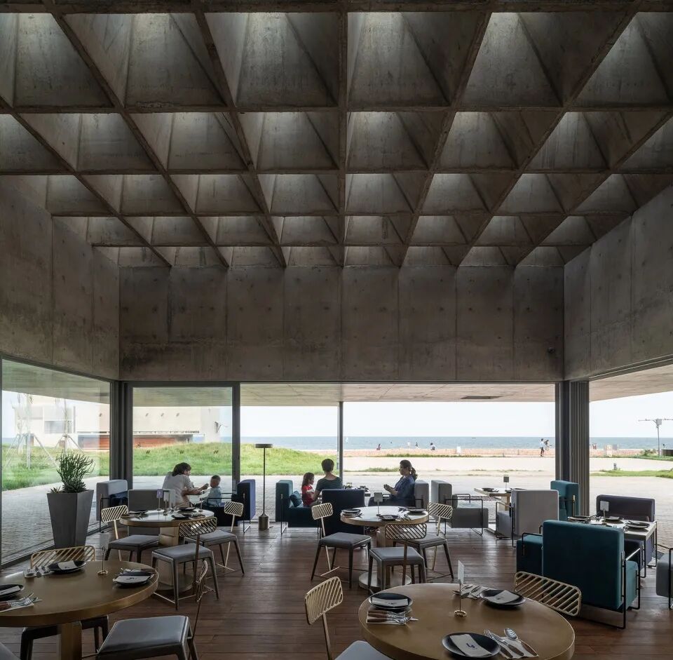 相比图书馆作为一个具有整体性和明确空间边界的精神性场所,风、光线和周边视野等自然元素在空间中被再次定义和塑造。在那里,人于海是一种“凝视”的关系。而对于餐厅,设计师希望呈现出来的是一种非整体化的,更加轻松、日常的空间氛围。相对于图书馆中被“凝视”的角色,海在餐厅成为了某种背景,人们在就餐之余瞟向大海,就不经意地看到了海上发生的一切。