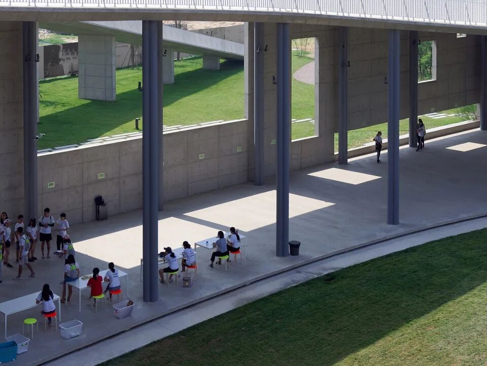 此项目位于阿那亚滨海度假地产开发区中部的带状沙丘上。一条连续螺旋坡道起始于沙丘一侧,环绕建筑的两个庭院上升,逐渐达到最高点后重新落回到沙丘的另一侧。其中靠外侧的庭院被设计得更为开放,用来组织集体活动;而靠内部的一个则被一层的教室与二层的宿舍包围,更多用于安静而内向的活动。