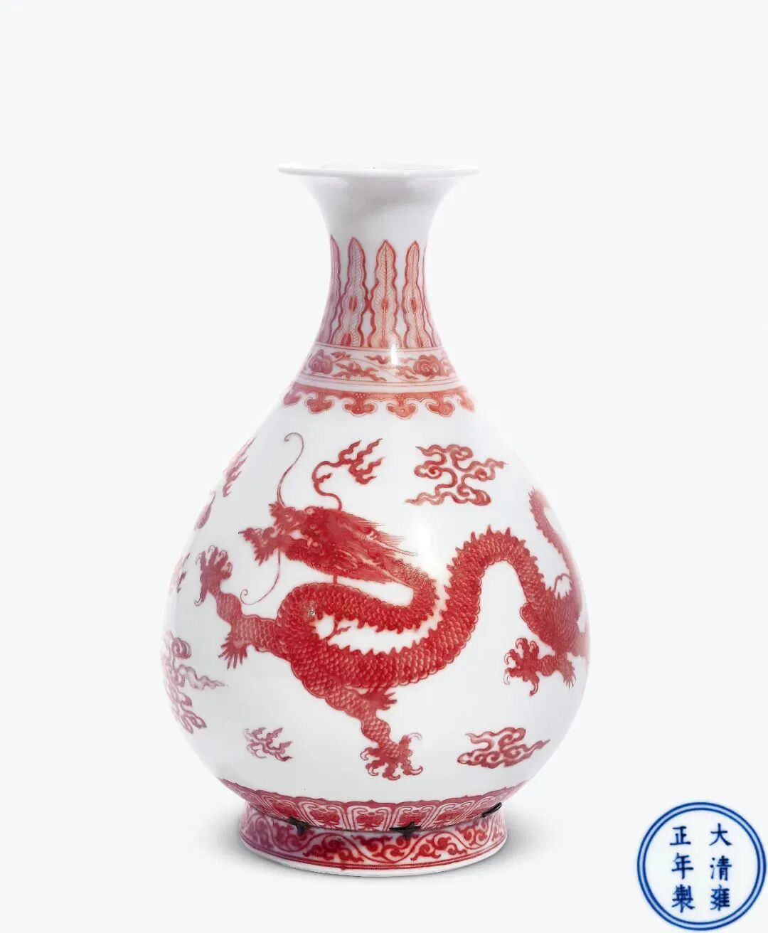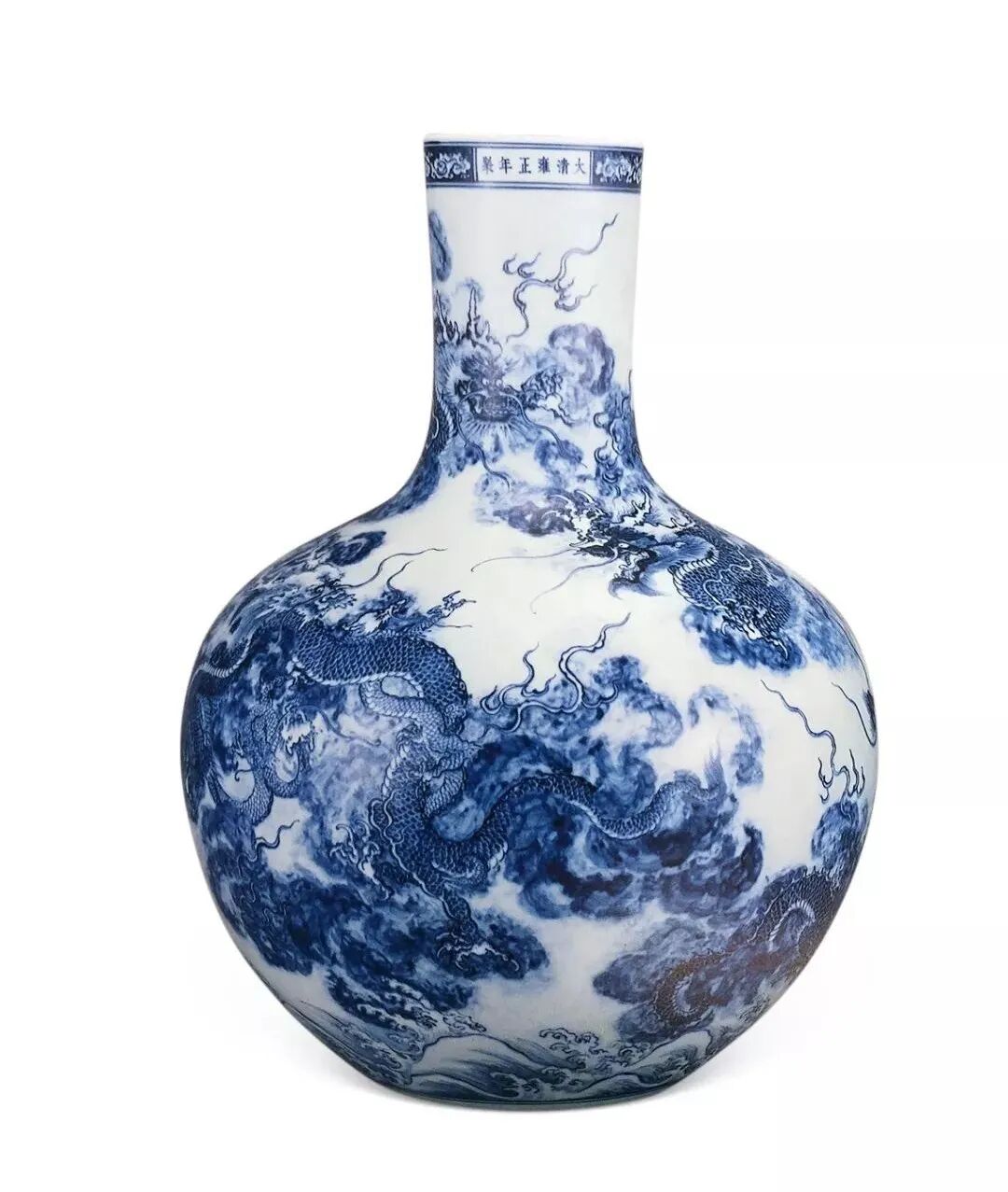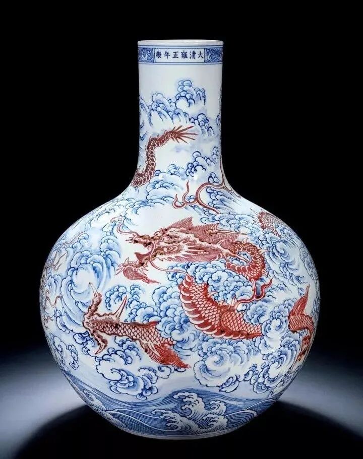 ▲清雍正 御制青花釉里红云海腾龙大天球瓶