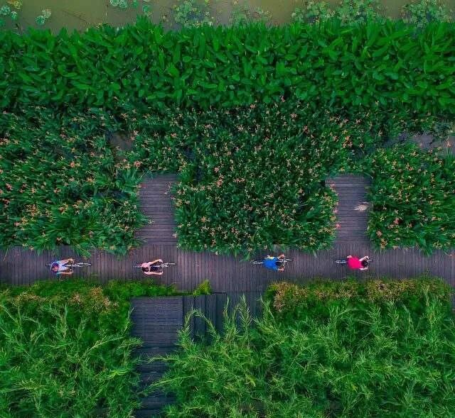 有清新的水质和繁茂的植物,就有追逐而来的动物们。麻雀、蟛蜞、青蛙、白鹤、野鸟、野鸭都能在湿地里寻觅到身影,人们骑车穿梭其间感受城市间的郊野氛围。