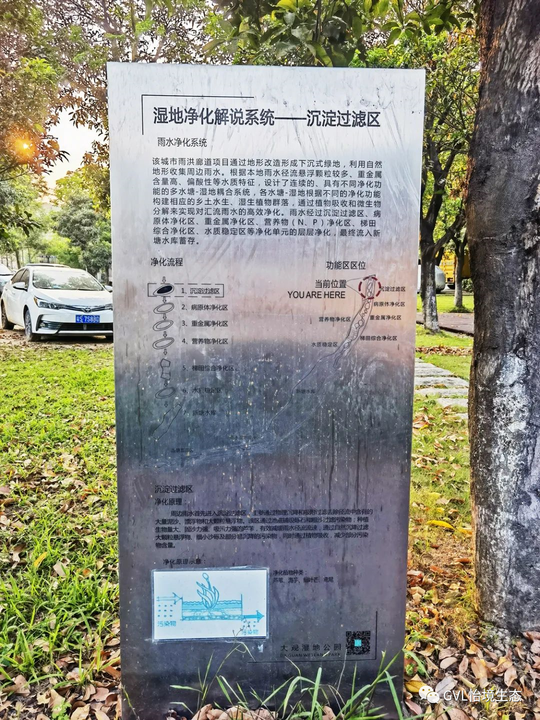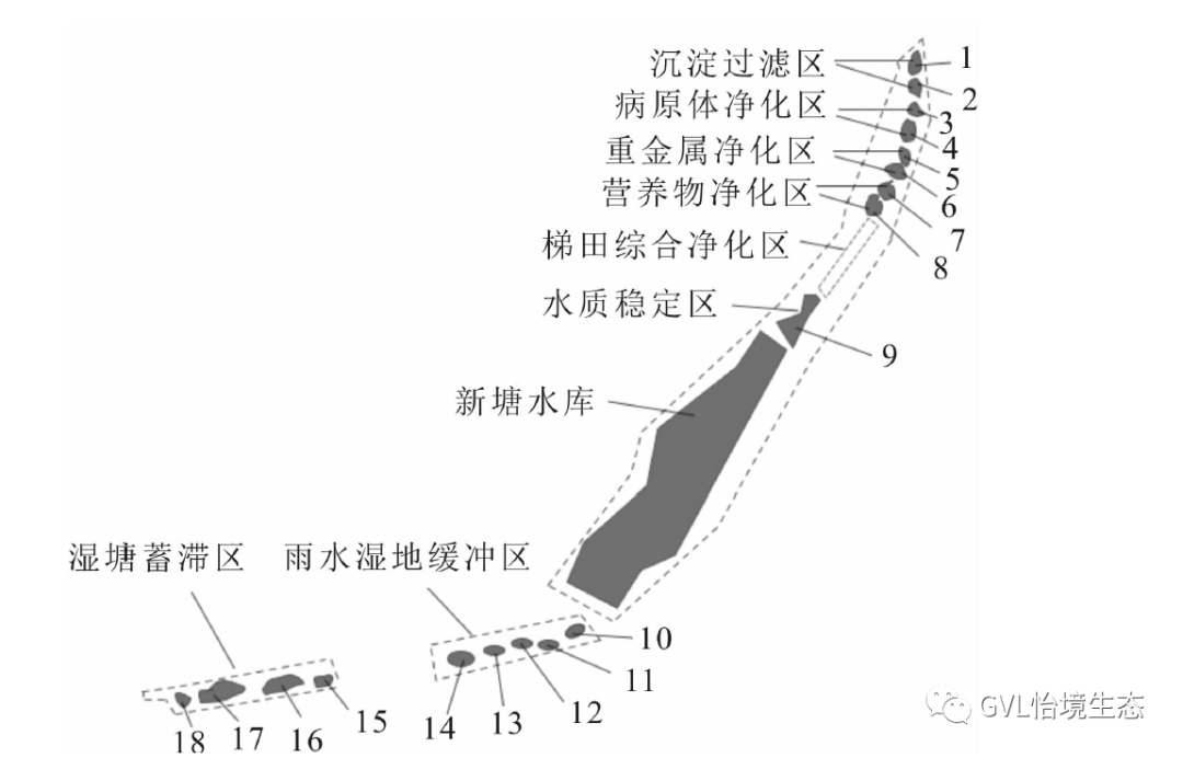 湿地公园设计的亮点在于科学利用地形,将生态水泡系统将净化流程分为沉淀过滤池、病原体净化区、重金属净化区、梯田综合净化区、水质稳定区和新塘水库。