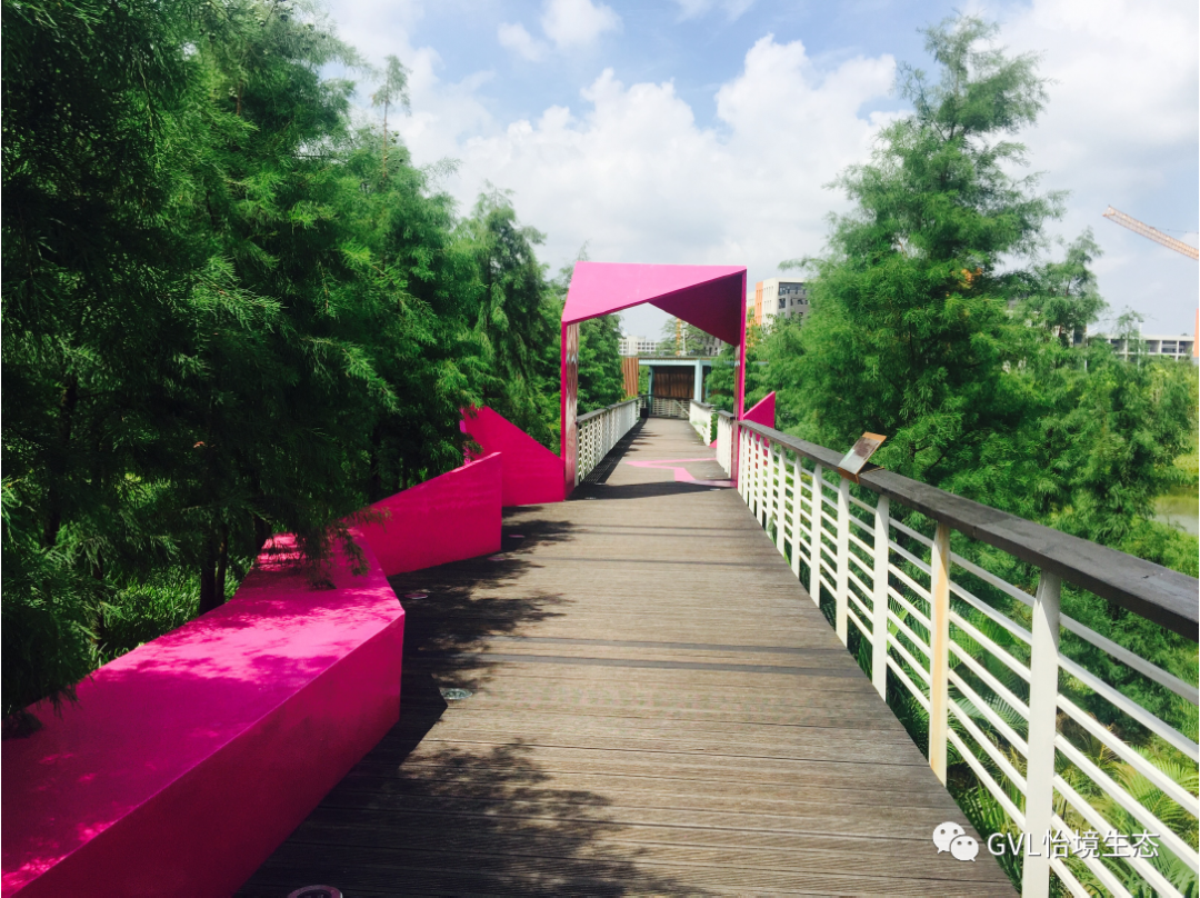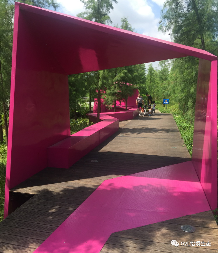 大观湿地公园充满了浓浓的“土人”风格,延续了俞孔坚的飘带rural art(乡村艺术)风格。赋予飘带新的桃红色外衣,在每个一级园路塔楼附近,都会有飘带构筑物,起到标识和串联的地标和节点作用。桃红的构筑物和夏季深色的植物配搭在一起,整个公园有一种夏日的清新感觉。园中还有许多昆虫和小动物,整个氛围非常生态舒适,给人一种仿佛回到小时候乡下外公外婆家里后院的新奇感受。