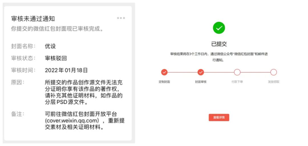 最关键的是证明材料,由于红包封面对版权意识非常重视,所以审核原则十分严格,作品有版权文件最好了,如果没有,需要上传制作图的分层源文件,如还是被驳回,可能还需要身份证明或者录制制作过程视频。