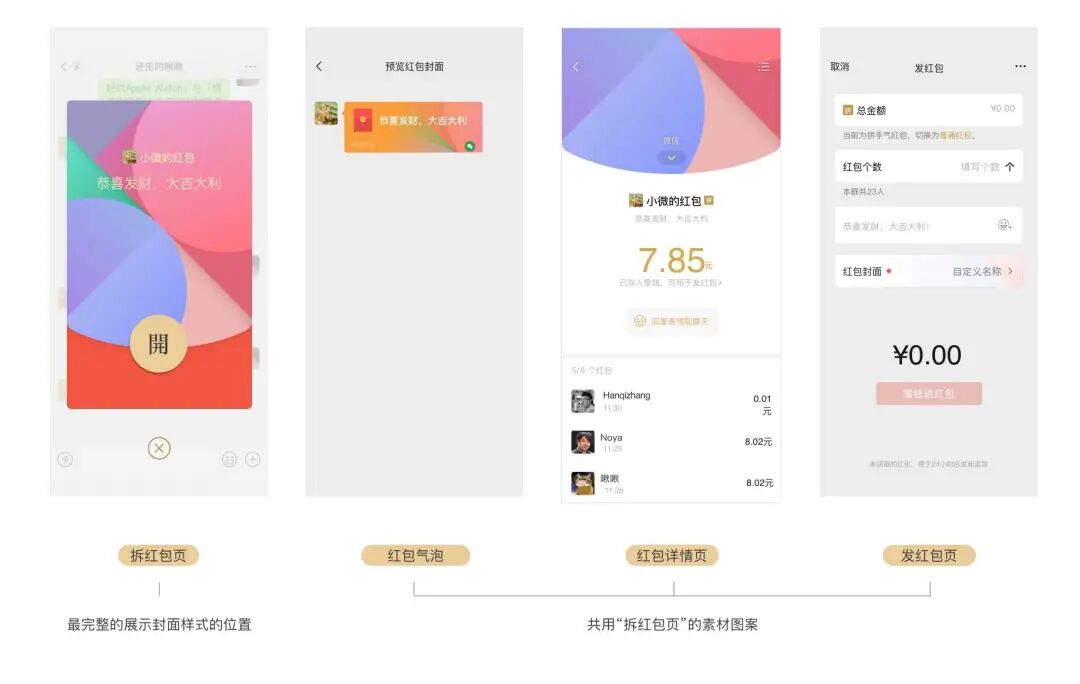 红包封面样式包括拆红包页,气泡,红包详情页,发红包页,其中,主要展示样式就是拆红包页。
