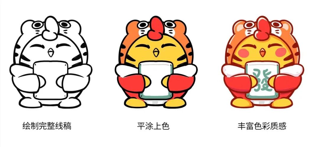 接下来细化绘制每个形象,风格主要以粗线条为主,类似矢量的平涂风格,以恭喜发财为例,先画好完整线稿,平涂上色后再丰富下色彩质感:
