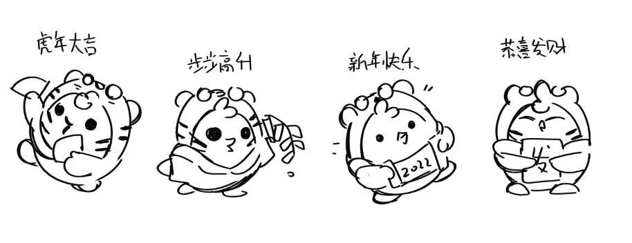 这次以「优设鸡」形象搭配虎年元素,结合新年祝福语设计四款形象,分别为“新年快乐”“恭喜发财”“步步高升”“虎年大吉”,先设计好主形象草图Pose: