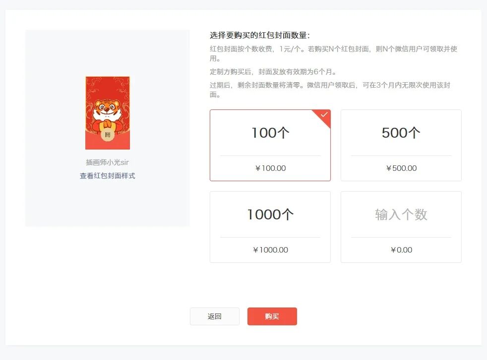 正式购买,红包封面是按个数收费,1元/个,定制方购买后,封面发放的有效期为6个月。