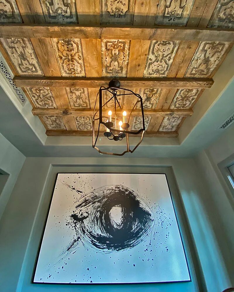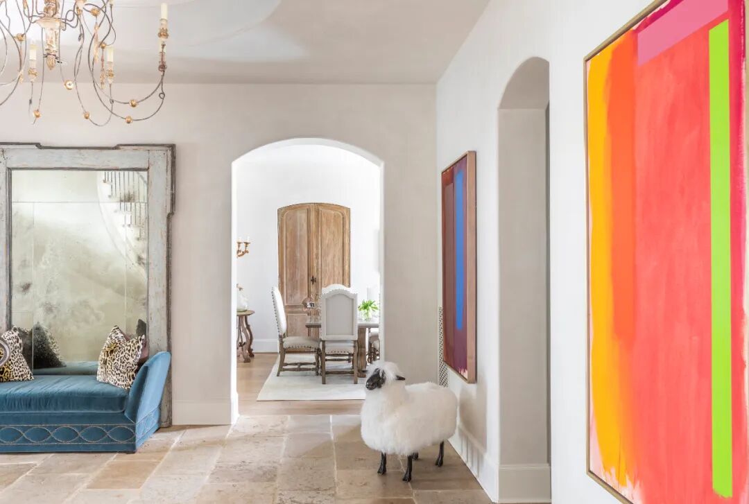 纪念性的古董壁炉架/Donald Baechler和Bill Fenoglio艺术作品被陈列在门厅。