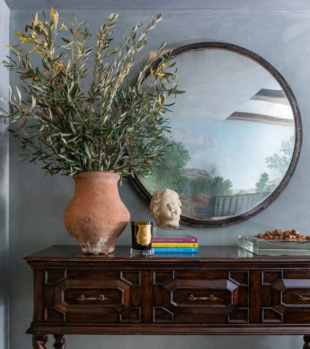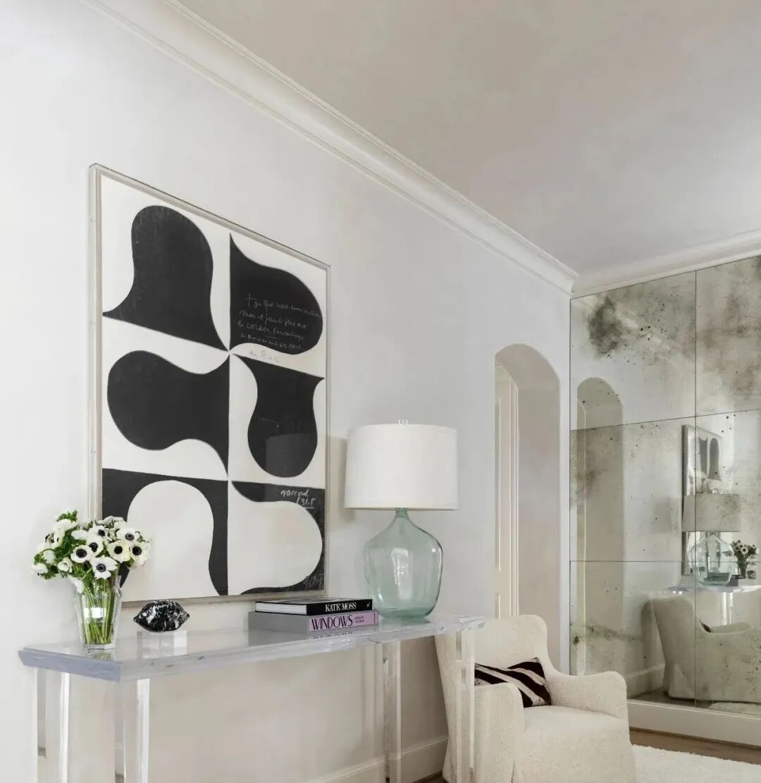 艺术作品在房间中也起着关键作用,Bassam Fellows的皮吊椅、Hunt Slonem和David Yarrow的作品都是来自这对夫妇的艺术收藏。室内保留了之前的中性的家具,比如重新利用了主人的古董衣橱。对于镜子,设计师引入了丙烯酸制品,以帮助反射光线,让镜子的镜面更加柔和,这是Kara在整个房子中使用镜子的一个技巧。